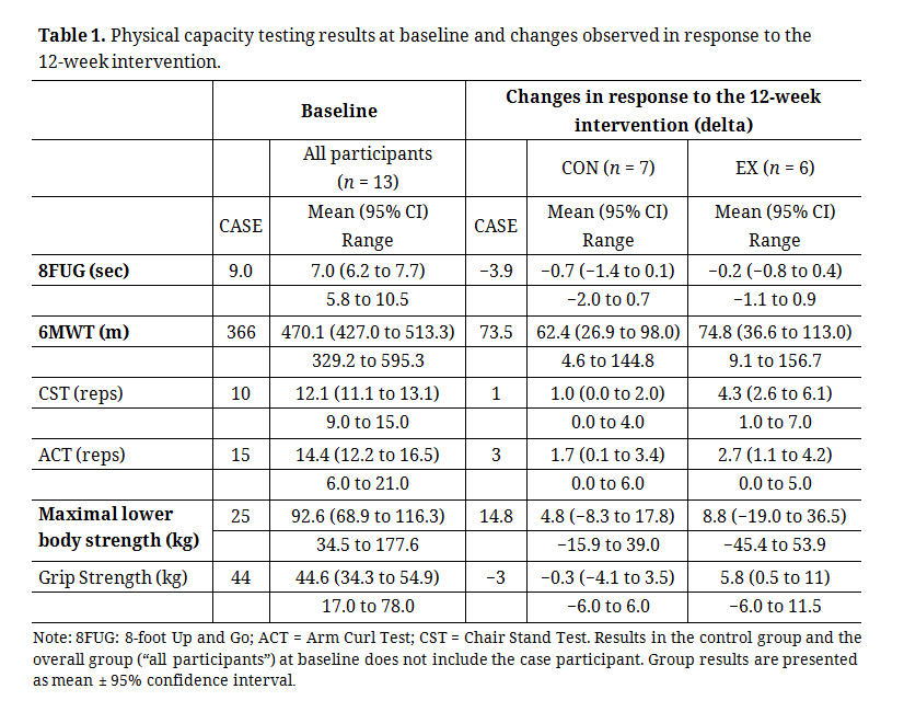 Of note, considering the three tests where the participant expressed fear of falling or worsening her symptoms at baseline (6MWT, 8FUG, 1RM leg press), her baseline results were under the lower bound of the 95% confidence interval (CI) of the rest of the overall sample (Table 1). From a clinical standpoint, her pre-intervention results could be considered low with the 6MWT distance and the 8FUG time under the 25th percentile [14], as well as the leg press 1RM under the 10th percentile [12].