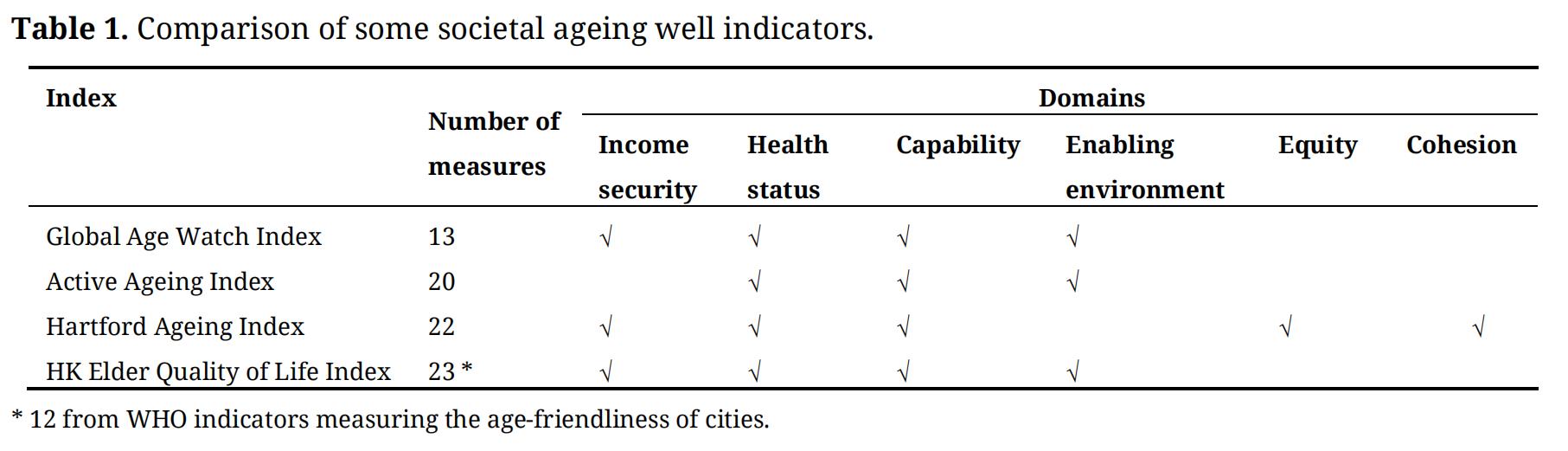 Population ageing is a phenomenon that is taking place in all countries, irrespective of whether they are classified as high, middle of low income countries, as a result of advances in public health. In general there is agreement that a desirable objective would be that older people may remain healthy in a broad sense to include both physical and psychological well-being, be functionally independent, and be engaged in society. Much research has been carried out in the past 2 decades on this topic. There is also consensus that achieving this goal depends on multiple domains outside of the traditional health and social care systems, to include various aspects of the physical and social environment, as well as financial security. Initially various terms have been applied to this desirable state, from successful ageing [1], healthy ageing [2], to active ageing [3]. The origins of these terms are developed from predominantly social or medical science disciplines, and taken up by different countries and organizations with a view to informing policy. Based on these concepts, various indicators with summary scores have been proposed, as an indicator of how societies are responding to the population ageing challenge. These include the Global Age Watch Index proposed by Age UK [4], the Active Ageing Index proposed by the European Union [3], the Ageing Society Index score or Hartford Ageing Index proposed by the United states for OECD countries [5], and the intrinsic capacity measure adopting a life course approach proposed by the World Health Organization in 2016 [6,7]. Such developments are very relevant, since ageing incorporates health as well as social domains involving expects from multidisciplinary backgrounds. However the question then arises of which indicator to use for comparison, and whether one indicator derived from one country or a group of countries with similar cultures, economy and health and social care systems may be used or whether each society has to develop its own, following similar principles.