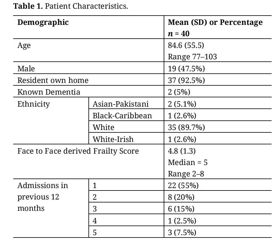 40 patients were recruited: 21 (53%) were female, 36 (90%) were white, the majority lived in their own home (37 (93%)) and 2 (5%) had a known diagnosis of dementia (see Table 1).