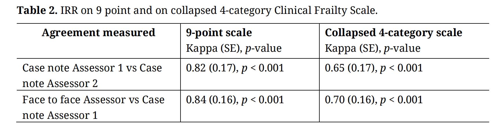 Results: A Kappa of 0.84 was estimated for the IRR between the scores derived from a face to face assessment and those based solely on inpatient records, indicating good agreement. The Kappa score fell to 0.7 when a 4 category collapsed version of the CFS was used. The IRR appeared unaffected by the number of times a patient had been admitted recently.