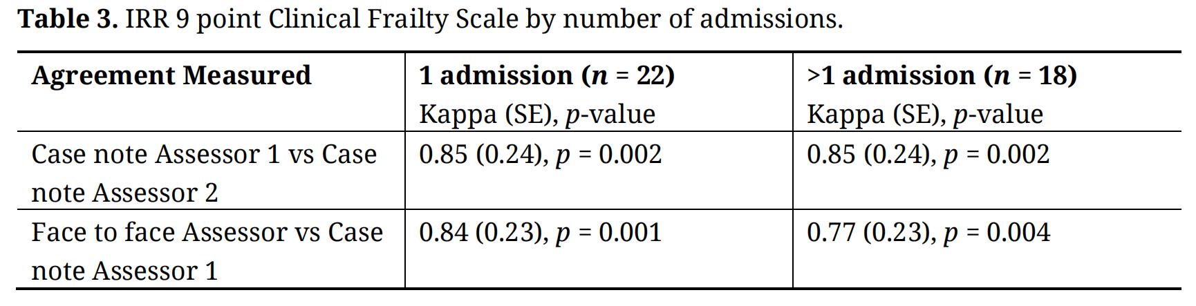 Methods: Forty newly admitted patients aged 65 and over were prospectively recruited at Bradford Royal Infirmary. A CFS score was assigned to each patient using a face to face assessment. A CFS score was independently assigned to each patient solely using information in the inpatient records. A quadratically weighted Cohen’s Kappa was used to estimate inter-rater reliability (IRR) between the assessments.