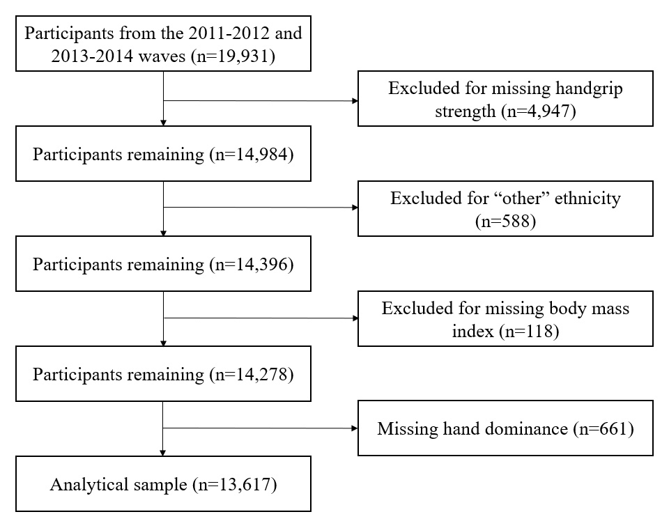 Age, gender, and ethnicity (Hispanic, non-Hispanic Asian, non-Hispanic Black, non-Hispanic White) were self-reported. A fixed stadiometer was used to collect standing height and a digital scale (Mettler-Toledo International; Columbus, OH) was used to collect body mass. Body mass index (BMI) was calculated as body mass in kilograms divided by height in meters-squared. Given that body composition may impact strength capacity, we included both absolute HGS and HGS normalized to BMI (HGS normalized to BMI = HGS (kg)/BMI (kg/m2)) in our analyses [14]. A diagram for participant exclusions is presented in Figure 1.