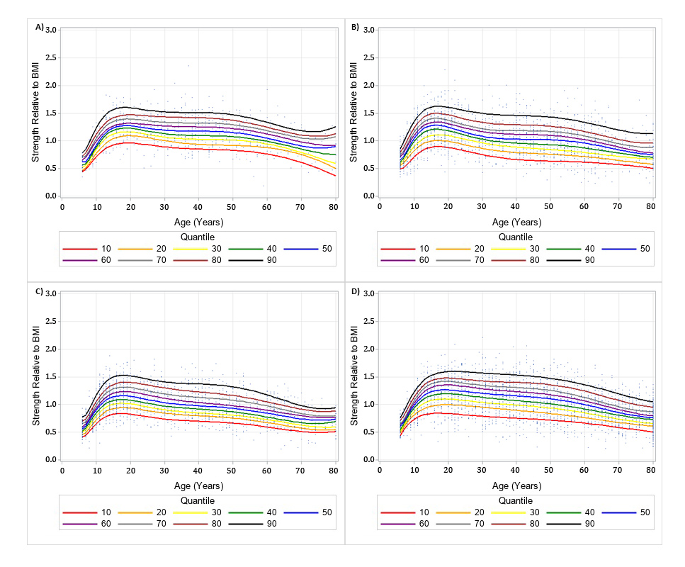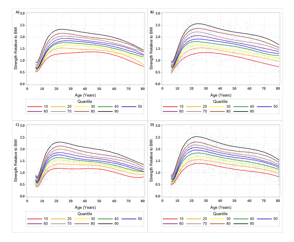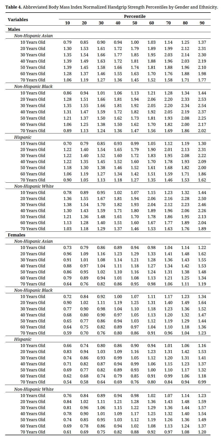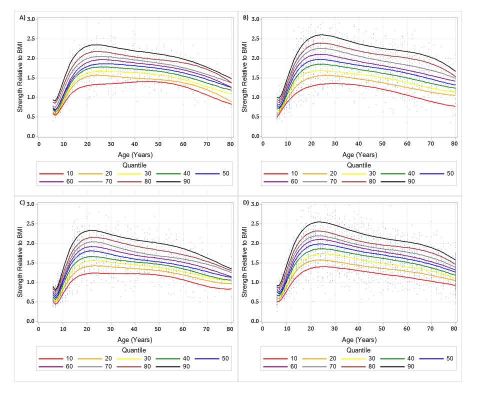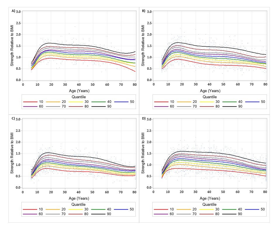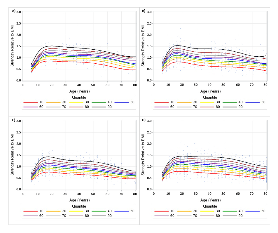 Results: Differences in absolute HGS and HGS normalized to BMI quantiles across ages existed for each ethnicity regardless of gender. In men, absolute HGS generally increased until about 25 years of age, began to decline around age 30 years, and regressed into older adulthood. In women, absolute HGS appeared to rise starting at age 6 years, peaked between 20 and 30 years of age, but was maintained into mid-life before declining in older adulthood. Similar results were found for HGS normalized to BMI.