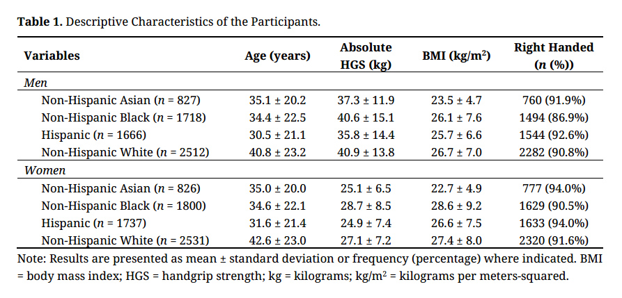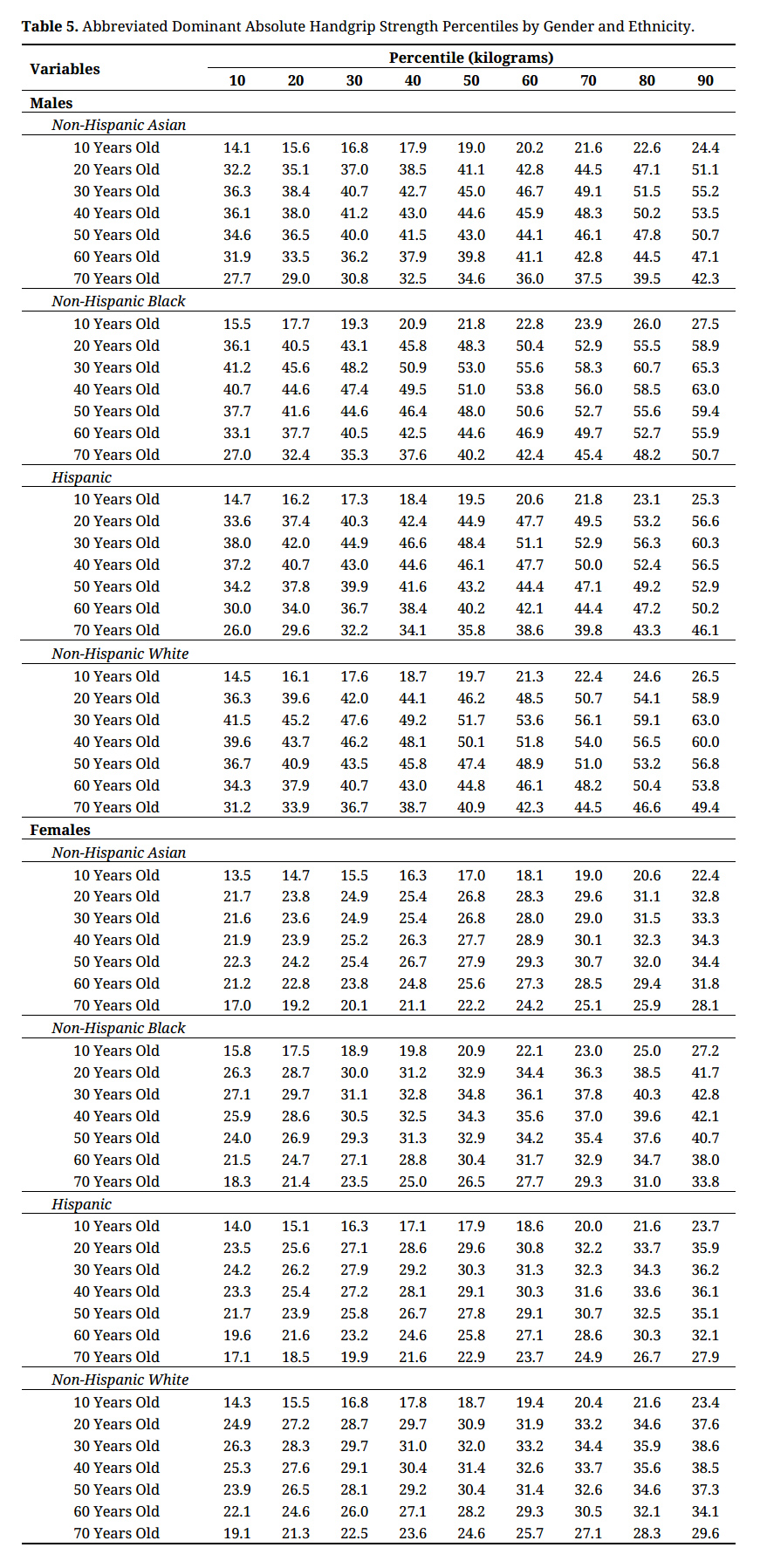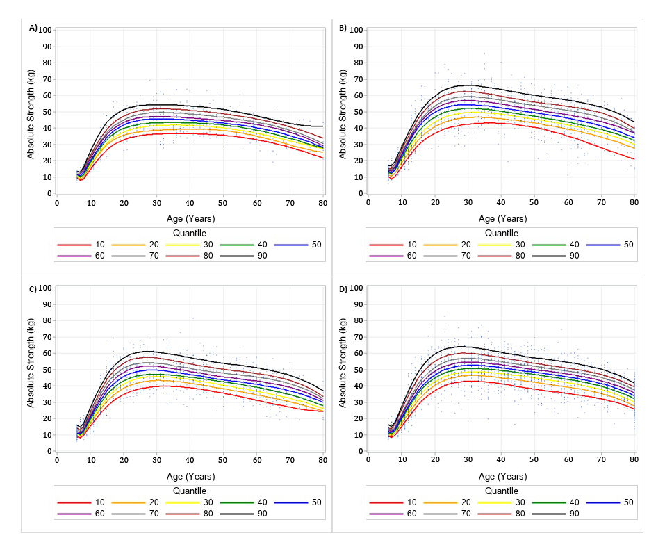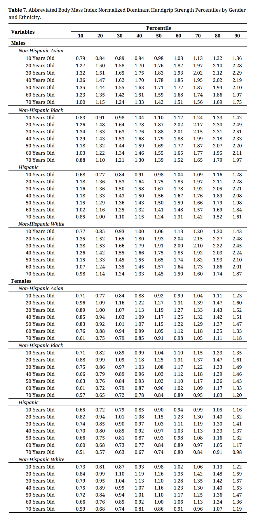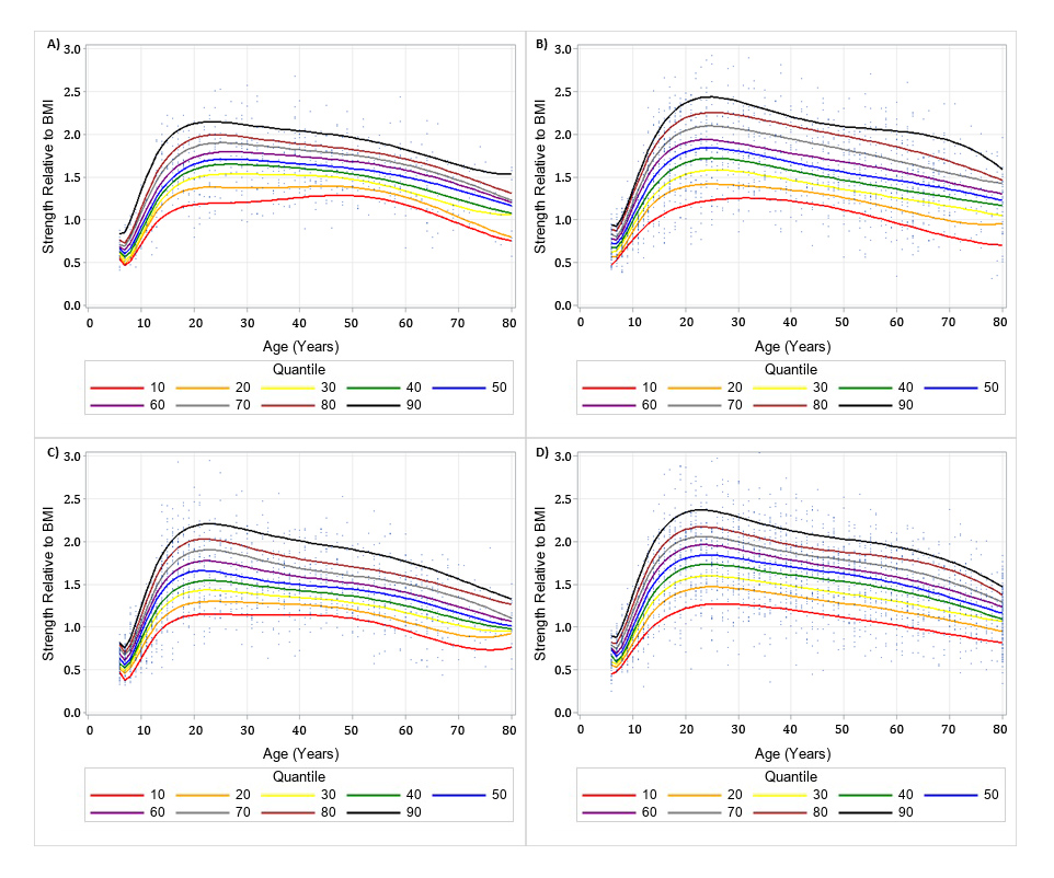 Results: Differences in absolute HGS and HGS normalized to BMI quantiles across ages existed for each ethnicity regardless of gender. In men, absolute HGS generally increased until about 25 years of age, began to decline around age 30 years, and regressed into older adulthood. In women, absolute HGS appeared to rise starting at age 6 years, peaked between 20 and 30 years of age, but was maintained into mid-life before declining in older adulthood. Similar results were found for HGS normalized to BMI.