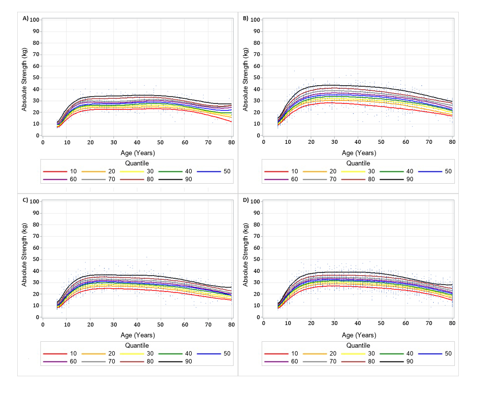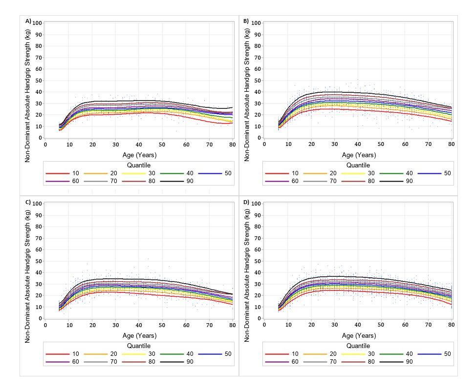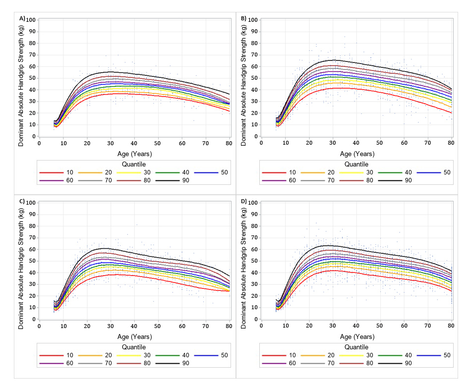 Statistical AnalysisAll analyses were conducted with SAS 9.4 software (SAS Institute; Cary, NC, USA). Parametric quantile regression models were run to generate absolute HGS and HGS normalized to BMI growth charts for the 10th–90th percentiles by gender and ethnicity for Americans aged 6–80 years. The same procedures were also performed for HGS data from the dominant and non-dominant hands. These 10 quantiles were pre-specified by investigators to bolster the interpretability of the results in the free-living environment. Fitted values for absolute HGS and HGS normalized to BMI were estimated at each ascertained age. Utilizing parametric quantile regression to create growth curves allows the models to fit conditional quantiles of strength capacity without assuming a parametric distribution, estimate the entire conditional distribution of the response, and reveal the effects of predictors on various parts of the response distribution, thereby making quantile regression feasible for analyses of datasets with larger amounts of observations such as NHANES [22].