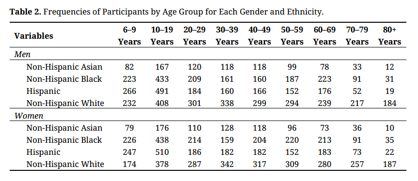 Gender and ethnicity are important factors that may influence muscle strength. For example, Silva et al. [10] showed that lifespan skeletal muscle mass was higher in men than women, and non-Hispanic Blacks had the highest skeletal muscle mass, followed by non-Hispanic Whites, Hispanics, and non-Hispanic Asians. These muscle mass differences may help to explain why HGS thresholds for determining weakness have emphasized stratification by gender and ethnicity [11–13]. Additional research is also recommended for developing predictive regression models for HGS that emphasize age, gender, and ethnicity [14]. Similarly, as HGS protocols continue evolving, examining the HGS of the dominant and non-dominant hands may provide important insights into how HGS is measured and data are used, especially because handedness changes throughout the lifespan [2,15]. Given the positive health aspects of muscle strength over the lifespan, along with the role gender and ethnicity have on strength capacity, assessments of strength could be individualized to gender and ethnicity. Creating lifespan muscle strength centiles by gender and ethnicity across ages will help to provide a detailed norm-referenced standard for comparing individual HGS measures to those from an American population-representative sample. Further, normative data for HGS is a high research priority for developing validated cut-points that improve how we diagnose sarcopenia [9]. The purpose of this study was to generate growth charts and curves for HGS by gender and ethnicity in a nationally-representative sample of Americans aged 6–80 years.