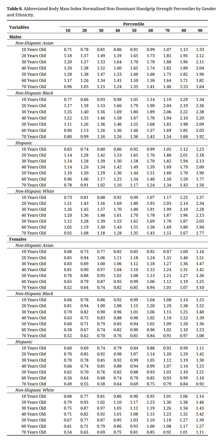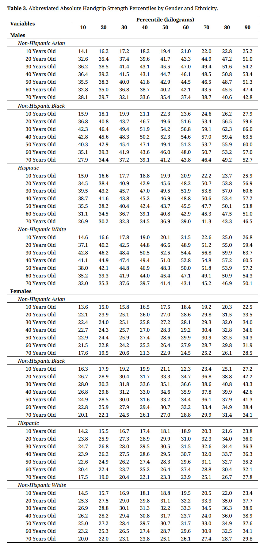 McGrath R, Hackney KJ, Ratamess NA, Vincent BM, Clark BC, Kraemer WJ. Absolute and Body Mass Index Normalized Handgrip Strength Percentiles by Gender, Ethnicity, and Hand Dominance in Americans. Adv Geriatr Med Res. 2020;2(1):e200005. https://doi.org/10.20900/agmr20200005