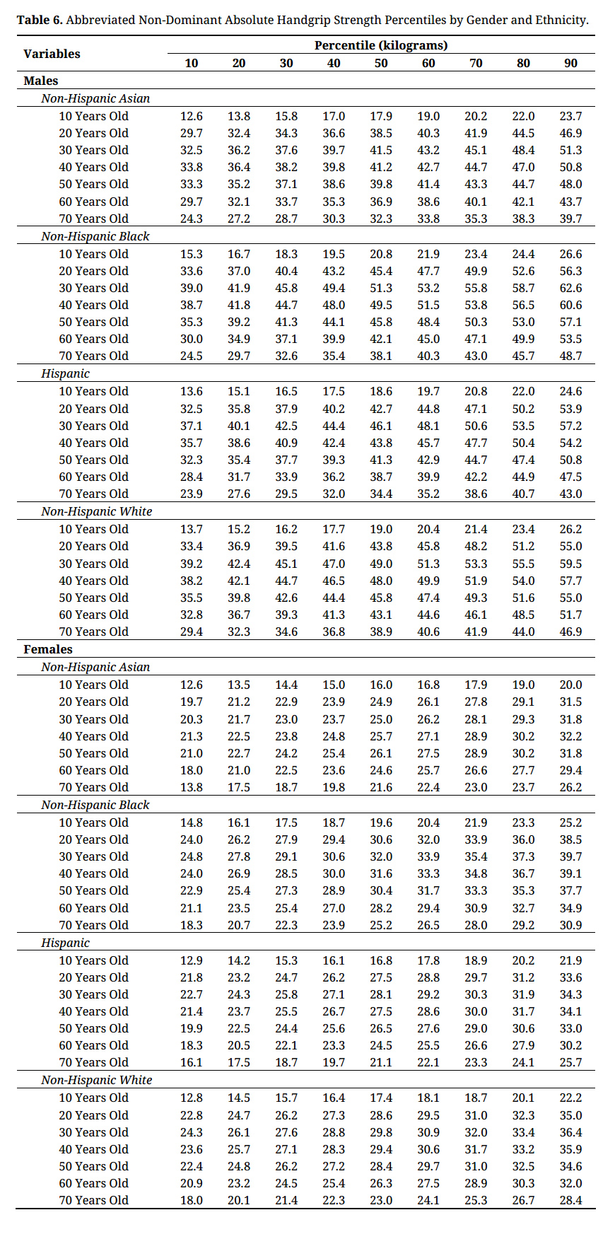 This investigation provided absolute HGS and HGS normalized to BMI percentiles by gender and ethnicity for Americans aged 6–80 years. Individuals could use these HGS centiles for comparing their HGS capacity to their American peers. Acknowledgement should be given to how gender and ethnicity factor into strength capacity throughout the lifespan, and how health outcomes from low muscle strength impact each gender and ethnicity differently. Moreover, utilizing both absolute HGS and HGS normalized to BMI in assessments of strength capacity will provide more detailed insights into how body composition influences muscle strength.