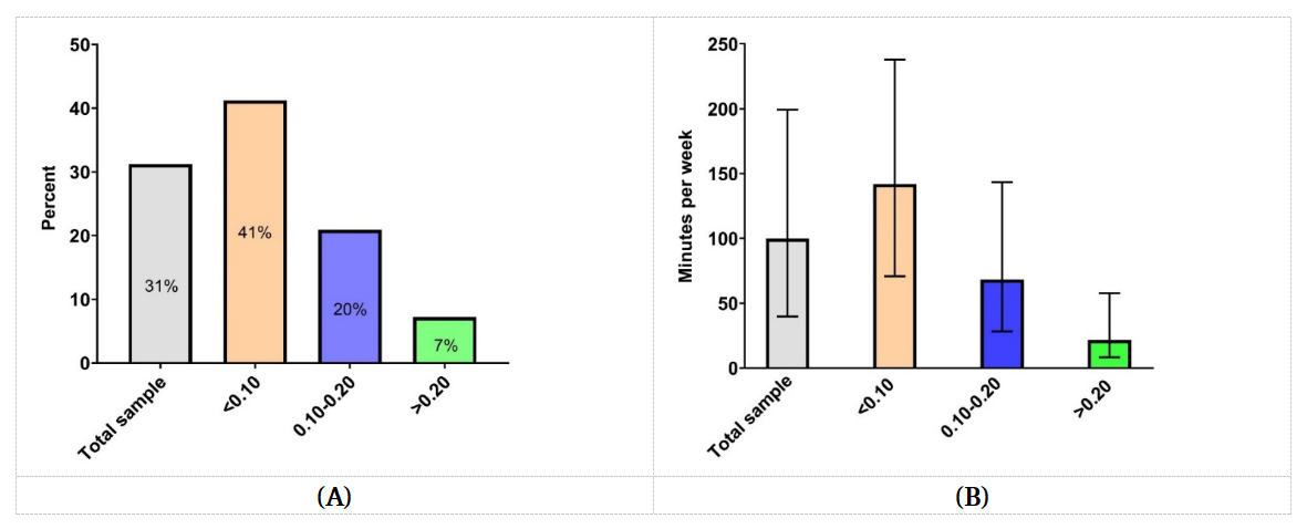 Physical ActivityThirty-one percent of participants met the aerobic component of the American Physical Activity Guidelines of 150 min of MVPA per week (Figure 1A). The proportion meeting physical activity guidelines decreased with higher frailty levels, as well as their level of weekly MVPA (Figure 1A,B). Median (interquartile range) for weekly MVPA was 100 (40–199), 141 (71–238), 68 (28–143), and 22 (8–58) for the total sample and the non-frail, minimally frail, and frail groups, respectively (p < 0.001 for group differences).