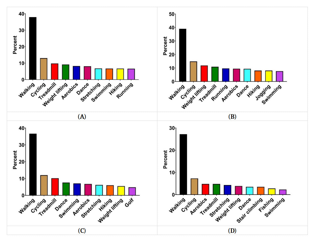 The top 10 most reported invidivual physical activities for the total sample and by frailty level can be viewed in Figure 2, Panels A to D. Walking was the most reported physical activity (approximately 30–40% reported particpating at least once in the last 30 days) for the total sample and all frailty groups. Cycling was the second most reported physical activity in all groups. Interestingly, there was a small percentage in all frailty groups who reported weight lifting at least once (Total sample: 9.8% (ranked 4th); Non-frail: 11.9% (ranked 3rd); minimally frail 5.5% (ranked 9th); Frail: 3.9% (ranked 6th)).