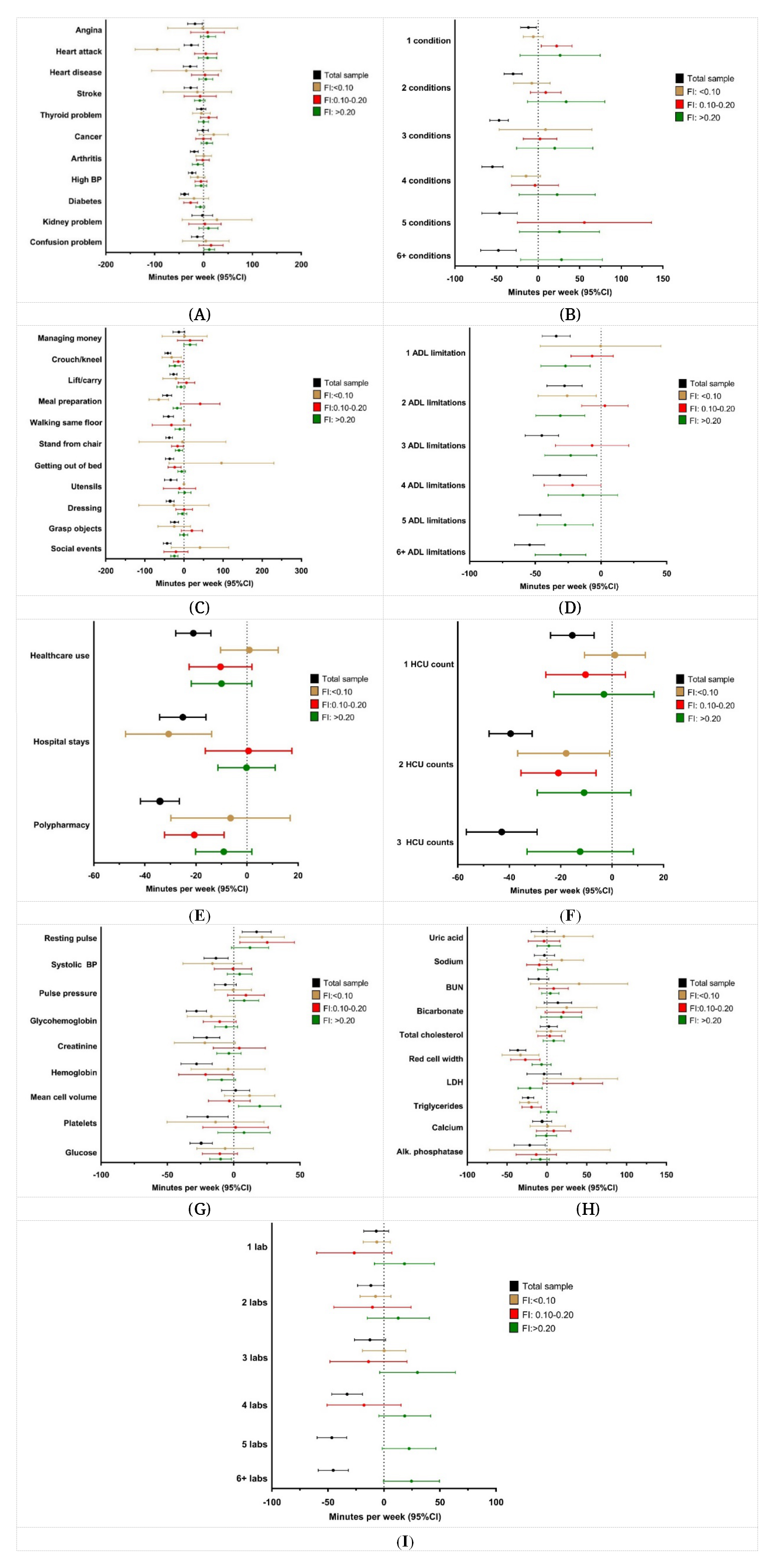 Individual deficits were shown to have a more widespread effect on MVPA levels when the total sample was analyzed. In particular, a greater accumulation of chronic conditions, ADL difficulties, healthcare utilization, and laboratory abnormalities, had a dose relationship with lower MVPA levels (Figure 3B,D,F,I; Supplementary Table S2). In contrast, the relationship between FI deficits and MVPA were generally mitigated when analyses were completed across frailty level. These data somewhat conflict with previous findings. For example, individuals from the UK Biobank who wore accelerometers were shown to have less weekly MVPA if they had almost any of the 147 chronic diseases examined [16]. We also showed that participants in NHANES 50 years or older accumulated approximately 50 fewer minutes (106 min vs 66 min) for those with cardiovascular disease compared to those without [17]. However, these previous studies did not stratify their analyses by frailty level. The total accumulation of deficits, regardless of a specific health problem, may account for the attenuated relationship with individual deficits and MVPA when we graded frailty. Indeed, a possible explanation may be that MVPA levels are simply lower as frailty severity increases (Figure 1A,B) which may make the strength of individual deficits on an inactive lifestyle less prominent. This idea supports the notion that what matters the most is knowing how many things are wrong with someone rather than individual health problems [18].