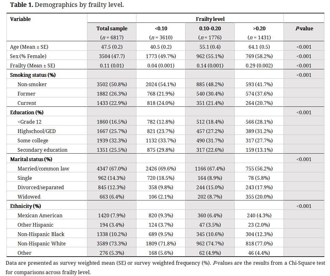 For the included sample, the average age of the sample was 47.5 (0.2), 3504 (47.7%) were female, and the average FI was 0.11(0.01) (Table 1). Participants with higher levels of frailty were older, had a higher proportion of females, were more likely to be former smokers, had a lower education, were less likely to be married, and be Mexican American or Other Hispanic. The proportion of individual FI deficits increased with higher levels of frailty (Supplementary Table S1).