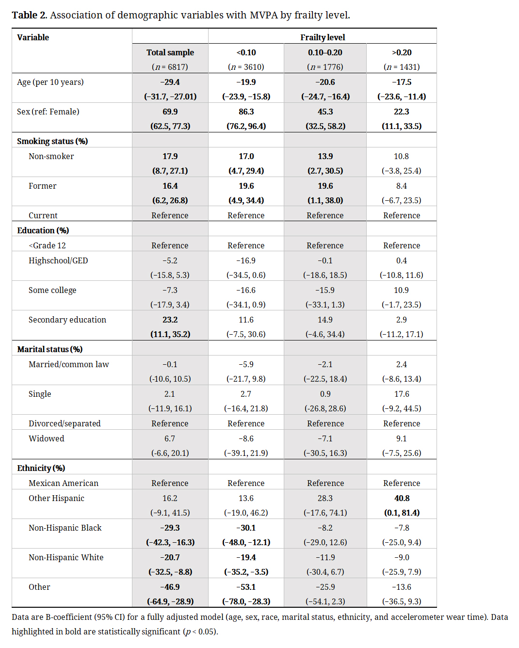 DemographicsIncreasing age was significantly associated with lower MVPA levels in the total sample (Table 2). Compared to females, males were more physically active. Former or non-smokers were more physically active than current smokers. Secondary education was associated with a higher MVPA level compared to those who did not graduate. Marital status was not associated with MVPA. Non-Hispanic Black and White, as well as “other” ethnic groups were less active than Mexican Americans. Across frailty levels, older age was consistently associated with less MVPA, whereas males consistently had higher MVPA compared to females. Non-smokers and former smokers were more active than current smokers for the non-frail and minimally frail groups, but not the frail group. There was no effect of education or marital status on MVPA across frailty groups. Non-Hispanic Black and White groups, as well as the “other” group compared to Mexican Americans, were less active in the non-frail group only. Race had no effect in the minimally frail group, whereas the Other Hispanic group were more active when compared to Mexican Americans.