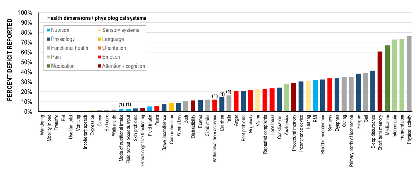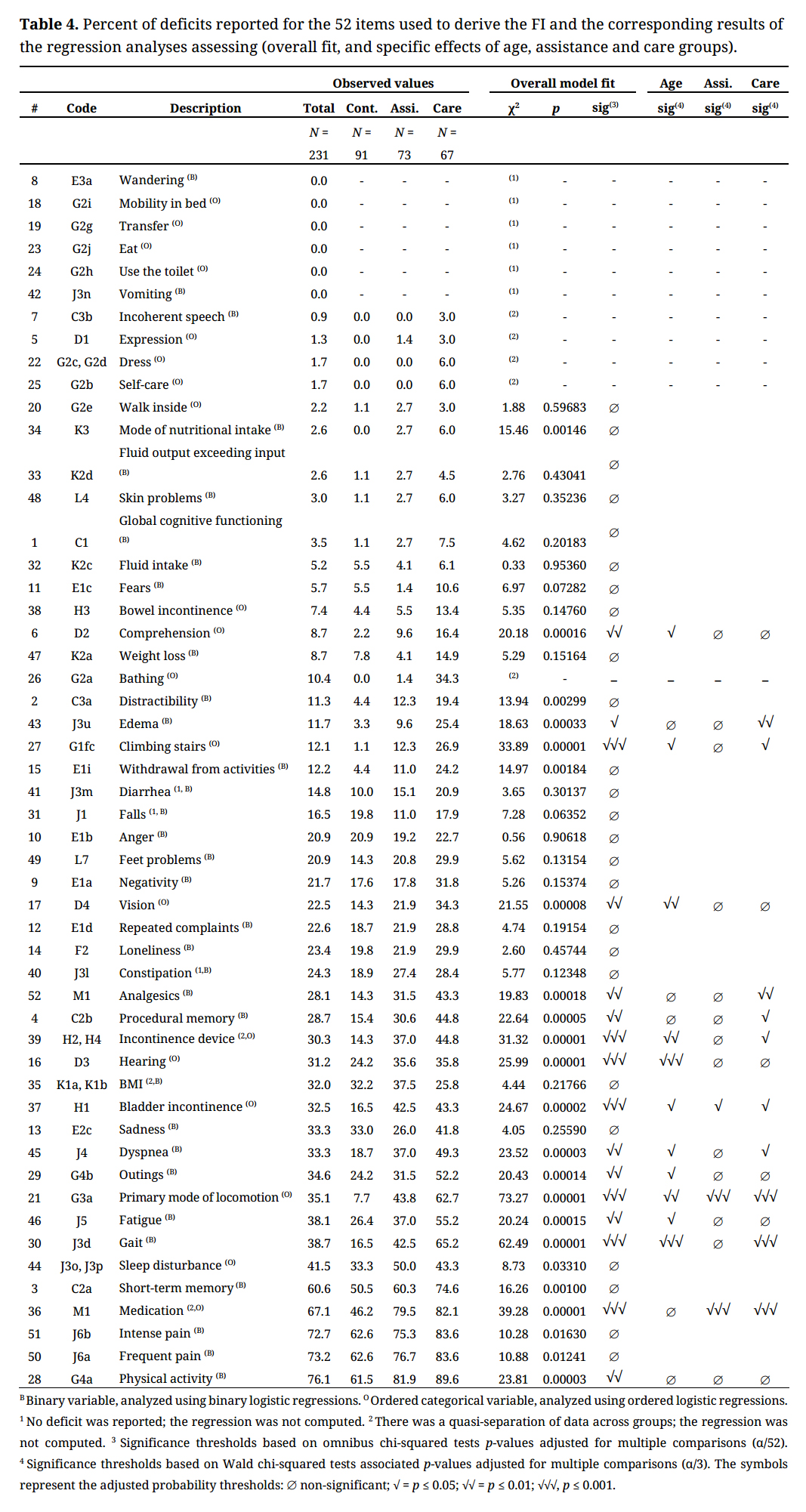 Frailty Index Analyses at the item levelThe first set of analyses were aimed at assessing the deficit rates reported for the 52 items used to derive the FI and at testing group differences for each item. The results summarized in Table 4 and graphically represented in Figures 1 and 2. As displayed in Table 4 and Figure 1, the percent of deficits reported by the total sample varied between 0 and 76%. Six items showed no deficits at all (wandering, mobility in bed, transfer, eat, using the toilet, and vomiting). Fourteen items showed less than 10% of participants with deficits. Fourteen items showed between 10% and 25% of participants with deficits. Thirteen items showed between 25% and 50% of participants with deficits, and 5 items showed 50% or more participants with deficits (short-term memory, medication, intense pain, frequent pain, and physical activity). When looking at the results of the regression analyses, findings first reveal that for five items, the regression models could not be adjusted because there was quasi-separation of data across groups; deficits of incoherent speech, expression, dressing, self-care and bathing were reported in most cases only in the Care group. Regression modelling allowed estimating the effect of age and group on deficit rates for forty-one items. For twenty-five items, the overall fit of the model did not reach the significance threshold of α ≤ 0.05 (adjusted p-value of p ≤ 0.00096), suggesting no reliable age-related differences or group differences in deficit rates (see Table 4). Interestingly enough, many of them belong to the emotion and affect domain (anger, 20.9%; negativity 21.7%; repeated complaints, 22.6%; loneliness, 23.4%; and sadness, 33.3 %). Some items of the physiology (feet problems, 21.0%; constipation, 32.0%; sleep disturbances, 41.0%), nutrition (BMI, 24.3%), cognition (short-term memory, 61.0%) and pain (intense pain, 73.0%; frequent pain, 73.0%) are also concerned by such a pattern of results. Finally, the overall fit of the regression model reached significance (adjusted p-value of p ≤ 0.00096) for sixteen items. The pattern of deficits highlighted for the assistance group concerned bladder incontinence, primary mode of locomotion and medication (see Figure 2, Panel C). The pattern of deficits highlighted for the care group (see Figure 2, Panel D) concerned medication, functional health (physical activity, gait, locomotion, and climbing stairs), systemic problems (bladder incontinence, dyspnea, fatigue, and edema), procedural memory and pain (analgesics). Finally, significant age-related increases (see Figure 2, Panel B) in deficit rate were reported in the language (comprehension), sensory (vision and hearing), physiology (incontinence device, bladder incontinence, dyspnea, and fatigue) and functional health (climb stairs, outing, primary mode of locomotion, gait) domains.