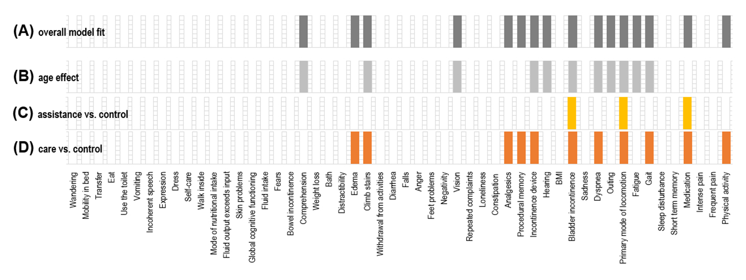 Figure 2. Schematic representation of the results of the regression analyses for the 52 items considered for the FI. (A). Items in dark grey showed a significant overall model fit (α ≤ 0.05, p-values adjusted for multiple comparisons) assesses by of chi-square (χ2) statistics. (B) Items in light grey showed a significant effect of age (α ≤ 0.05 for Wald χ2 statistics, p-values adjusted for multiple comparisons). (C) Items yellow showed a significant difference between the assistance and the control groups (α ≤ 0.05 for Wald χ2 statistics, p-values adjusted for multiple comparisons). (D) Items yellow showed a significant difference between the care and the control groups (α ≤ 0.05 for Wald χ2 statistics, p-values adjusted for multiple comparisons).