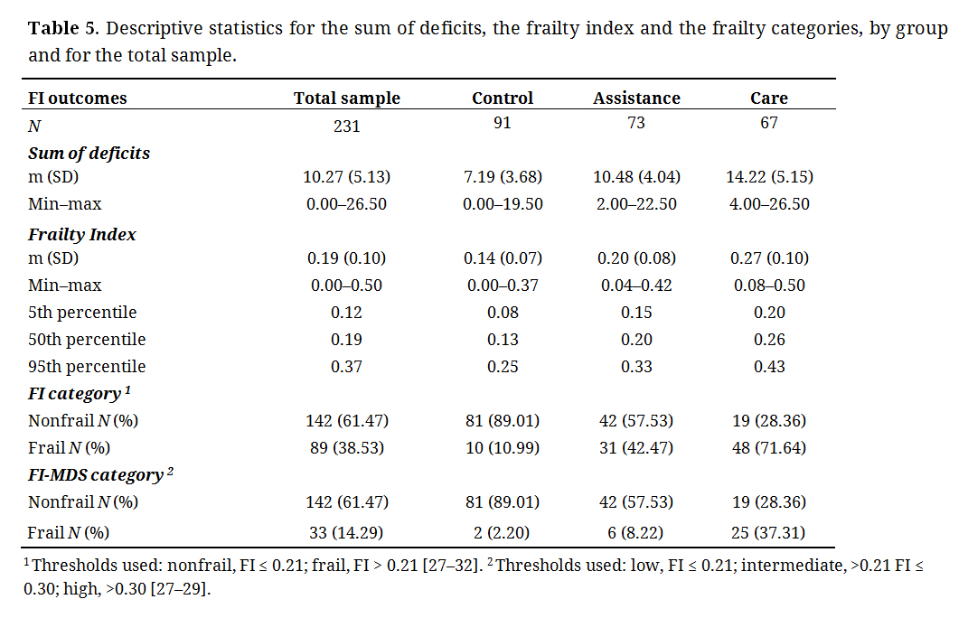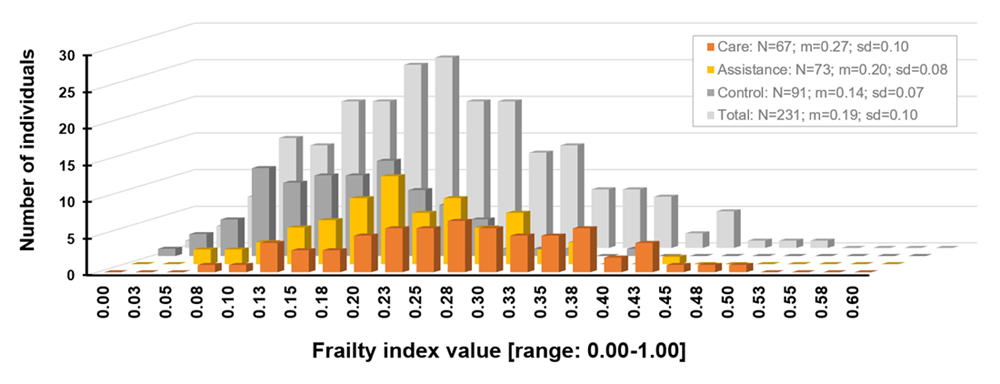 Results: The FI was normally distributed, with a mean of 0.19 (SD 0.10), and a value of 0.46 at the 99th percentile. The effect of age was significant (B = 0.003, 95% CI = (0.001–0.005)). As compared to the control group (FI = 0.14 ± 0.07, m ± SD), the FI was higher among individuals who received assistance (B = 0.04, 95% CI = (0.02–0.07)) and care (B = 0.11, 95% CI = (0.08–0.14)). These differences were adjusted for age.