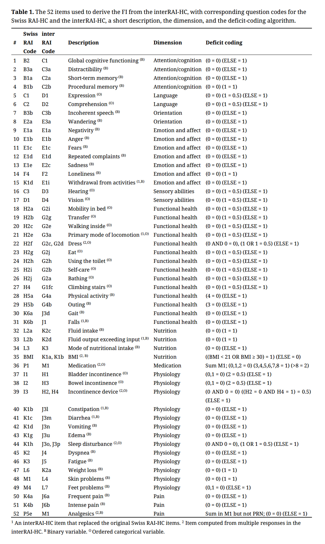 Primary Outcome Variable: The Frailty Index (FI) Derived from the interRAI-HCIn this paper, the primary outcome measure is a frailty index (FI) derived from interRAI-HC MDS. The FI’s computation relies on the “accumulation of deficits” model of frailty [14,15] and complies with the recommendations for FI computation [19]. The computation replicates the procedure previously described for the Swiss RAI-HC [44] on a clinical sample of 3714 homecare recipients which supported the choice of the items notably as concerns avoiding floor and ceiling effects in deficit rates [19]. Yet, because the Swiss RAI-HC is slightly different from the interRAI-HC, six of the 52 original items used for the FI’s derivation were not available in the interRAI-HC and had to be replaced. This replacement followed a two-step procedure. First, two raters separately identified candidate alternative items in the interRAI-HC. Second, inter-rater agreement was used to reach consensus in identifying replacement items. Table 1 displays the final set of 52 interRAI-HC items used to derive the FI. Each item is provided along with a short description, the corresponding question code (both for the Swiss RAI-HC and the interRAI-HC) and the response coding algorithm used to qualify the presence or absence of a deficit. The FI was computed as the sum of the reported deficits (ranging from 0 to 53) divided by the theoretical maximum deficit value [53], resulting in a score varying between 0.00 and 1.00.