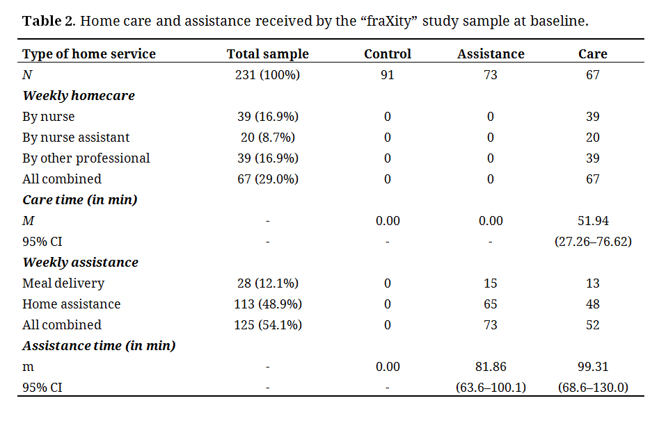Nearly 1000 flyers were disseminated over the recruitment period, and 307 individuals expressed interest in taking part in the study (30% response rate). Among these 307 persons, 63 (20.5%) declined to participate after being informed about the full protocol, 10 were not eligible (3.3%), and 3 (1.0%) were lost of sight after first contact. The final study sample consisted of 231 persons (75.2% inclusion rate), slightly below the sample size of N = 260 expected at baseline. Among these 231 persons, 91 were assigned to the control group, 73 to the assistance group, and 67 to the care group. Table 2 reports the characteristics of the formal home care and assistance the participants received on a weekly basis. All of the interviews were carried out during a single appointment (with the exception of one participant in the assistance group because the participant did not anticipate having enough time); the average duration of each interview was 107 ± 24 min (m ± SD, range 50 to 180).