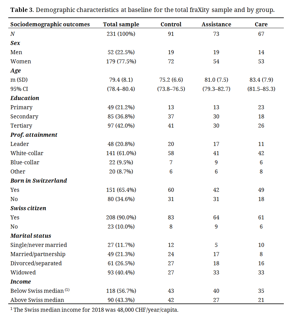 Demographic characteristics and patient-reported health outcomesTable 3 reports the sample’s demographic characteristics. The overall sample comprised 22.5% men and 77.5% women, revealing an over-representation of women. The average age was 79.41 ± 8.06 years (m ± SD). The participants were highly educated (42% reached tertiary-level education), and most of them reported high professional attainment (20.8% leaders and 61.0% white-collar employees). The most represented marital status was widowhood (40.4%). A large majority of the participants (90.0%) was Swiss citizens, and slightly more than half of the sample (56.7%) reported an income below the Swiss median. Inferential statistics conducted to assess group differences in the outcomes reported in Table 2 revealed no significant differences, with the exception of age, F(2, 228) = 27.25, p < 0.001. Post-hoc pairwise comparisons using Bonferroni corrections revealed that the Control group (mage = 75.19) was significantly younger than the assistance group (mage = 80.99, mean difference of 5.80, p < 0.001) and the care group (mage = 83.42, mean difference of 8.23, p < 0.001). The assistance and care groups did not significantly differ in age (mean difference of 2.43, p = 0.148).