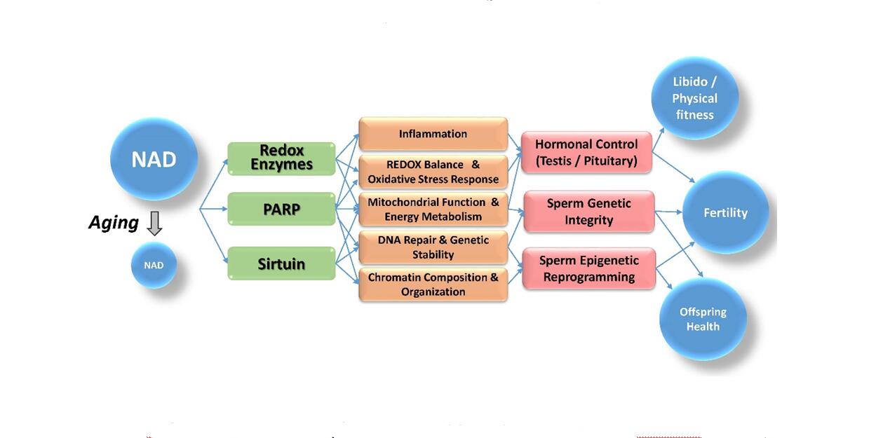 We propose that low body-wide NAD levels provide a plausible explanation for metabolic alterations that are associated with declining hormonal production and testicular volume, as well as reduced sperm quality in aging men.