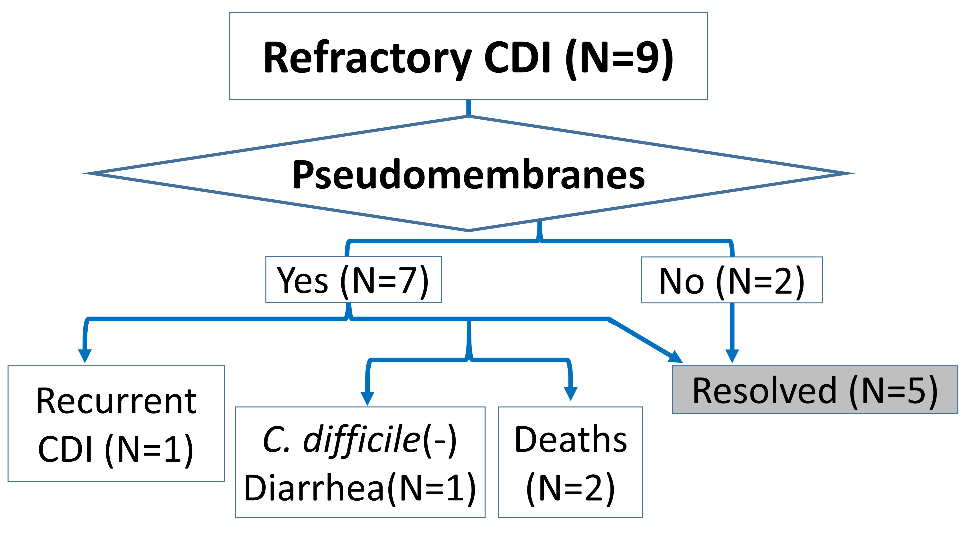 FMT ProcedureFMT procedure was similar as the procedure described in Shin et al. [16] for outpatient FMT in the Complicated C. difficile Clinic. Briefly, universal donor specimens were prescreened and purchased from OpenBiome (Boston, MA, USA). These stool samples were stored frozen and delivered to the inpatient unit using Pyxis system used in UVA Medical Center for medication dispensation. FMT was mainly performed through colonoscopy, but if the patient had special circumstances other routes were utilized, such as ileoscopy or upper gastrointestinal feeding tube in patients with ileostomy or colectomy. If pseudomembranes were visualized on colonoscopy during FMT, repeat FMTs were performed until there were no pseudomembranes seen on colonoscopy, similar to the protocol proposed by Fischer et al. [12] After FMT, there were no set protocol regarding treatment with C. difficile active antibiotics and decision to resume antibiotics was left to the discretion of the physician treating the patient. Eight out of the nine patients treated for refractory CDI received antibiotics after FMT.