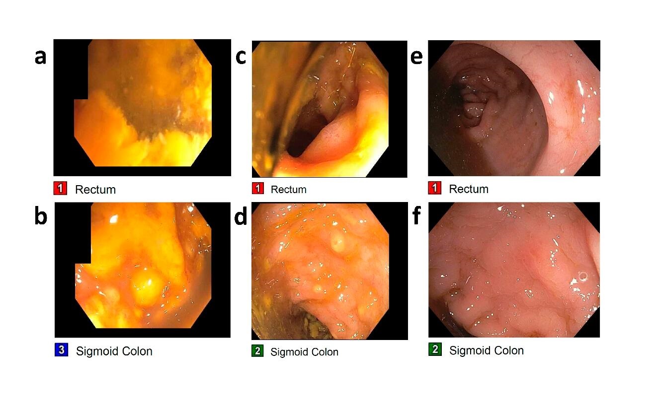 Figure 2. Colonscopic changes after FMT in patients with pseudomembranes from CDI. Colonoscopic findings from one patient shows yellow pseudomembranes covering both the rectum (a) and the sigmoid colon (b) during the first FMT. There is some improvement on the second FMT in the rectum (c) and the sigmoid colon (d). On the patient’s third FMT, both the rectum (e) and the sigmoid colon (f) exhibited resolution of pseudomembranes and healthy intestinal epithelium.
