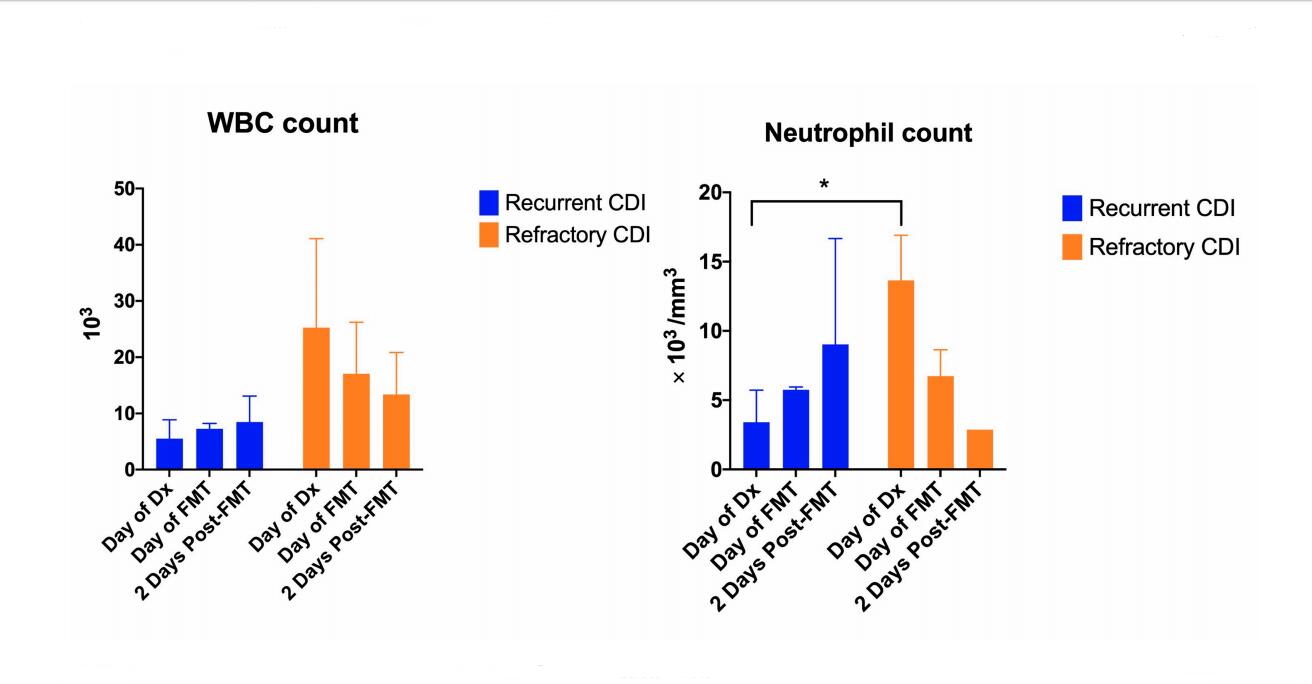 WBC count is a well-known marker of CDI severity [6], but neutrophil count is another factor that is strongly associated with severe outcome/deaths [25]. The elevated WBC count and neutrophil count seen at diagnosis with refractory CDI compared to recurrent CDI suggests higher inflammatory state with more severe disease. The decrease of these measures with FMT may suggest that FMT has an immunomodulatory effect.
