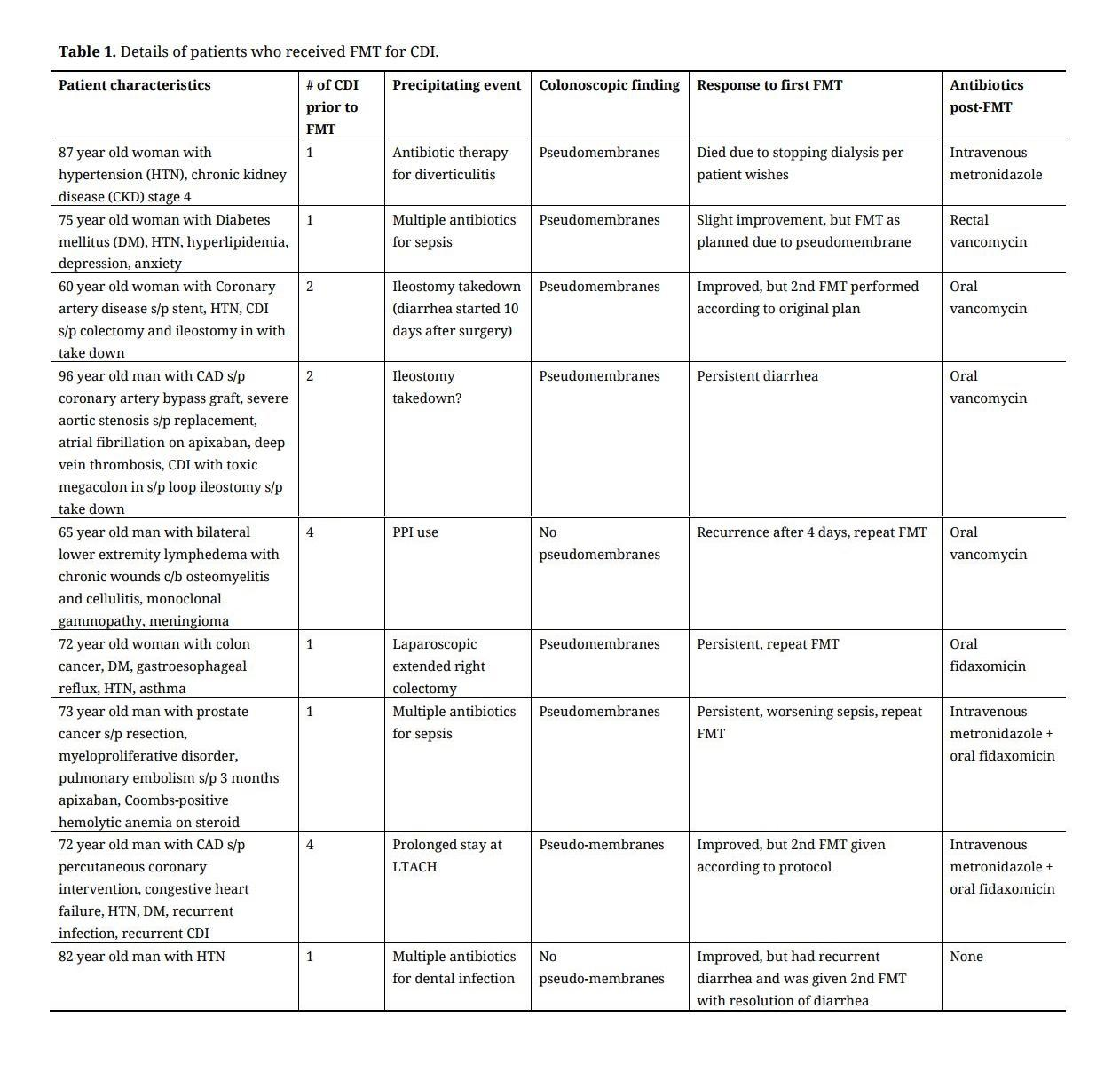 There were two patients who died within 90 days. The first patient was an 87 year old woman with history of HTN and CKD stage 4 who was admitted for CDI refractory to treatment, which was precipitated by antibiotic therapy for diverticulitis. Patient received FMT via flexible sigmoidoscopy one day after FMT as part of the treatment plan recommended by gastroenterology. Patient responded to FMT with a decrease in stool frequency but due to patient’s wishes to not receive dialysis, patient passed away from kidney failure 4 days after FMT. The second patient was a 73 year old man with prostate cancer s/p resection, myeloproliferative disorder, pulmonary embolism treated with apixaban for 3 months, and Coombs-positive hemolytic anemia on chronic steroids. Patient was initially admitted to the hospital with fever, rash, eosinophilia, lactic acidosis and respiratory failure. The diagnosis was unclear, with sepsis, strongyloidosis with potential for hyper-infection syndrome, drug reaction with eosinophilia syndrome (DRESS), and hematologic malignancies all considered possible causes. Patient was treated with antihelminthics for parasitic infections, multiple broad spectrum antibiotics for bacterial or fungal infections, and immune suppression for DRESS. 2 weeks after admission, patient developed fever, diarrhea, and CT abdomen/pelvis finding of diffuse wall thickening, surrounding edema, and mild dilation of the colon consistent with severe infectious colitis. Patient immediately underwent loop ileostomy and vancomycin lavage but developed worsening leukocytosis and persistent high volume output through ileostomy. FMT was performed 10 days after loop ileostomy via ileoscopy while continuing treatment with IV metronidazole and PO vancomycin then fidaxomicin. Patient was not evaluated for pseudomembranes. Patient initially improved and was able to transfer to the floors from intensive care unit (ICU), but had new leukocytosis and fever after 2 weeks, leading to ICU admission again. Patient received a second FMT about 18 days after the first FMT with no pseudomembranes noted via colonoscopy. Patient continued to decline with sepsis and patient passed away after withdrawing care. Interestingly, patient also developed worsening rash with peripheral eosinophilia and atypical lymphocytes as well as a high CMV viral load for which he was started on IV ganciclovir therapy for possible cytomegalovirus (CMV) colitis.