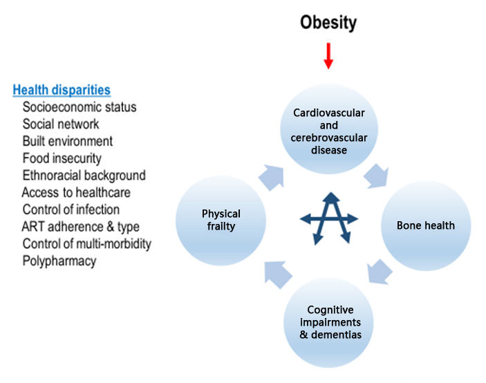 Obesity among WWH is not only related to ART, but can also result from health disparities factors that are pervasive among aging WWH. These factors interfere with healthy living practices, and access to public health and health care interventions for obesity, T2D, CVD and cerebrovascular diseases [13–19]. Health disparities arise from variations in sociodemographic variables (age, income, education race/ethnicity and culture); challenging built environments that are common among major urban centers with high population densities and inherent barriers to physical activity promoting sedentary lifestyles; food insecurities; food deserts characteristic of urban environments (areas where access to healthy food is limited and unaffordable); employment and unemployment stresses; dealing with competing interests such as care-giving for children, grandchildren, aging parents, and other family members; and lack of social support. (See Figure 1) Thus, primary prevention of obesity is largely neglected, often followed by poor management of sequelae as secondary and tertiary intervention strategies, and bone health is often ignored.