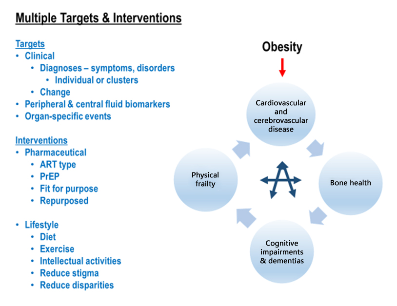 It is unclear whether WWH and obesity experience accelerated and/or aging with excess morbidities, and whether more adverse aging is related to the infection per se, the inflammatory and metabolic effects of the infection and adipose tissue, obesity effects of HIV medications, or an overall HIV + obesity-initiated and/or -mediated increase in allostatic load over the life course [98,99]. Better understanding of this area will propel us forward to a new and novel area of investigation linking brain and periphery in aging HIV [73,79].