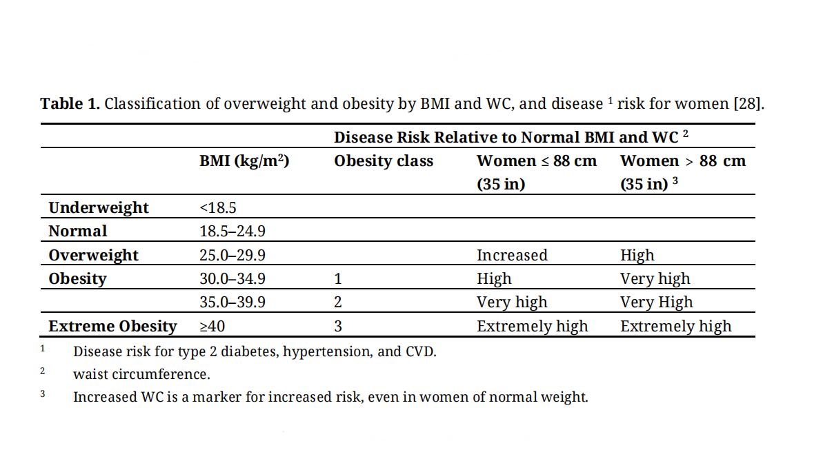 Table 1. Classification of overweight and obesity by BMI and WC, and disease 1 risk for women [28].