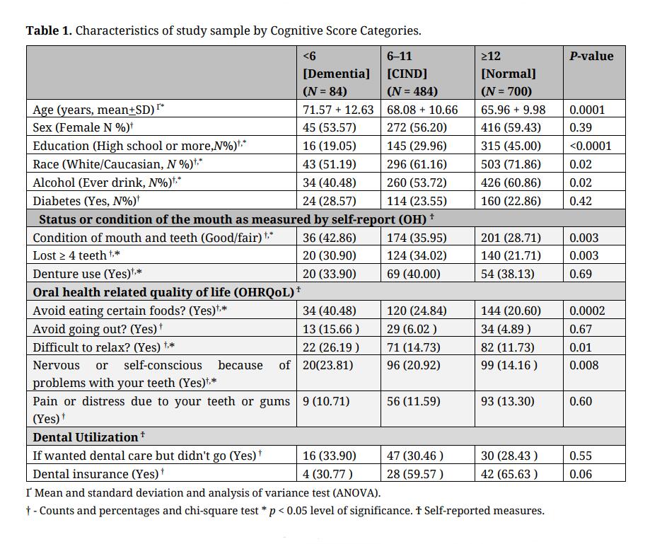 Joshi P, Kaufman LB, Cabral H. Oral Conditions, Oral Health Related Quality of Life and Cognitive Function: Preliminary Results from the Health and Retirement Study. Adv Geriatr Med Res. 2021;3(4):e210020. https://doi.org/10.20900/agmr20210020