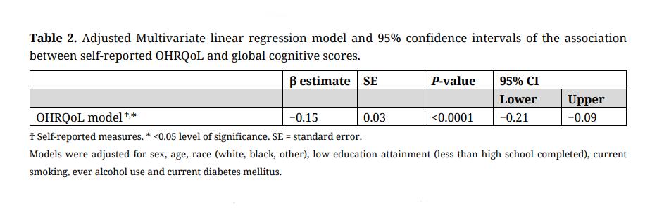 Table 2. shows the results of the multivariate linear regression model testing the association between self-reported OHRQoL and Global cognitive scores. The model was adjusted for sex, age, race, low education attainment (less than high school completed), current smoking, ever alcohol use and current diabetes mellitus. The adjusted model shows that individuals with worse self-reported OHRQoL had 0.15 units lower global cognitive scores (β = −0.15, SE = 0.03, p ≤ 0.0001).