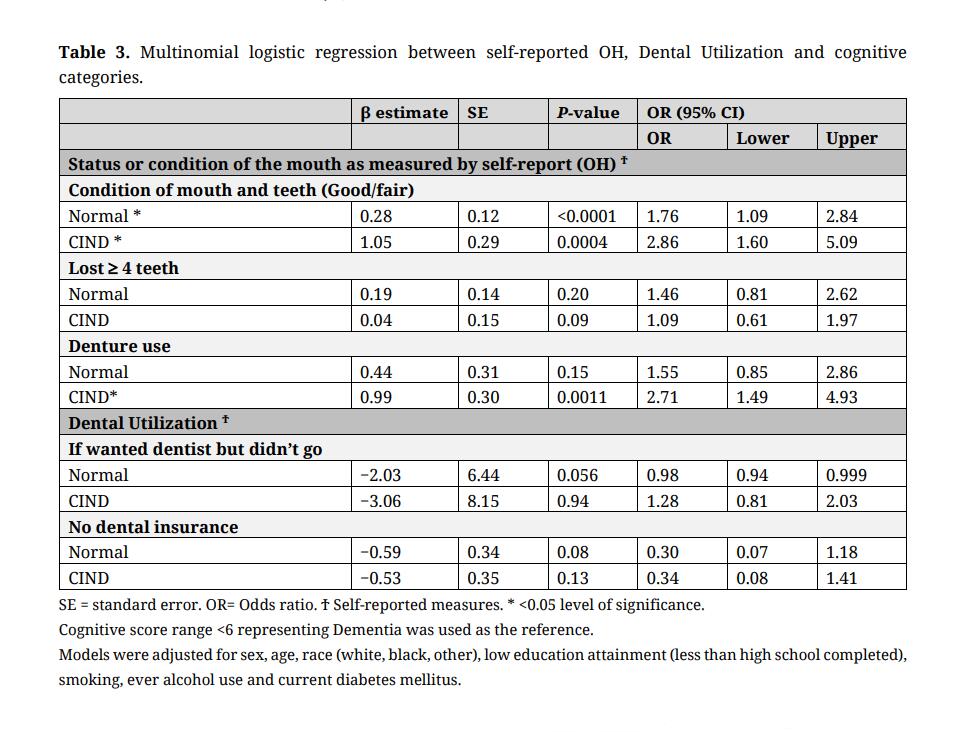 Results: We found that participants with worse OHRQoL had 0.15 units lower global cognitive scores (β = −0.15, SE = 0.03, p = < 0.0001). Compared to those with dementia, participants in normal and CIND categories had greater odds of better OH (ORNormal = 1.76, (95%CI: 1.09–2.84); ORCIND = 2.86, (95%CI: 1.60–5.09)). Furthermore, participants in the CIND category had greater odds of using dentures compared to participants with dementia (ORCIND = 2.71, (95%CI: 1.49–4.93)). We did not find any statistically significant association between tooth loss or dental utilization and dementia.