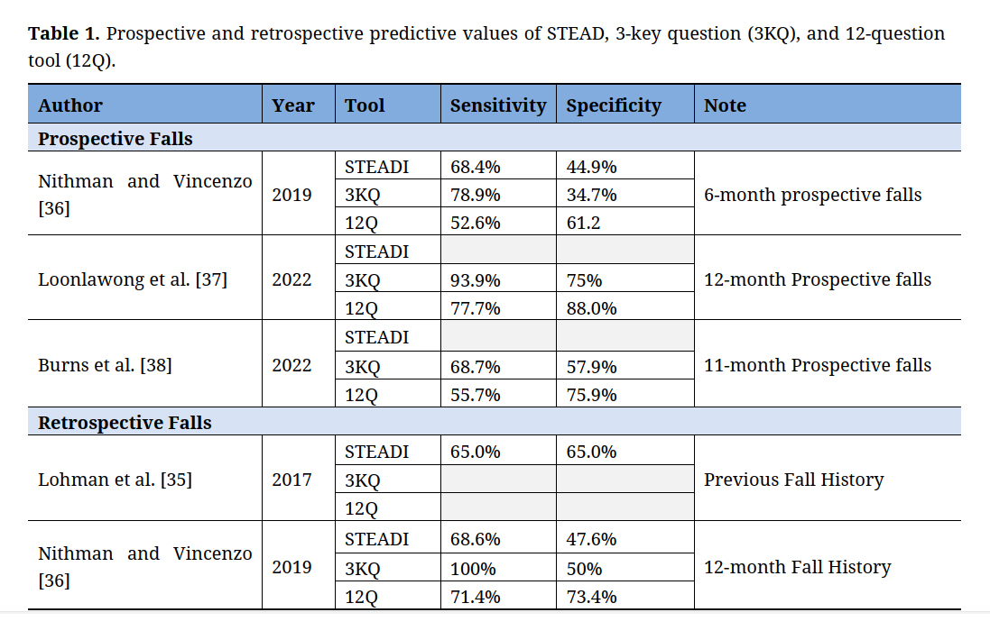 The purpose of this review was to discuss the predictive validity, improve the predictive validity of STEADI, and apply STEADI in different clinical settings.