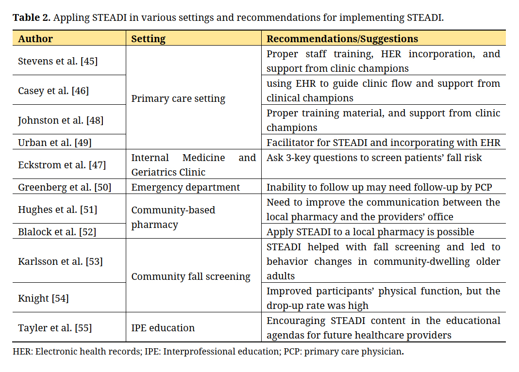 Applying STEADI in Different SettingsStudies examining the use of STEADI in primary care settings may provide insightful recommendations during the integration process. Table 2 summarized the recommendations/suggestions when implementing STEADI in different settings. Stevens et al. concluded STEADI can be integrated into a primary care setting with proper staff training, electronic health records (EHR) incorporation, and adapted into clinical workflow [45], while Casey et al. have suggested the key to successful employment of STEADI was using EHR to guide clinic flow and support from clinical champions [46]. Another study by Eckstrom et al. incorporated STEADI into EHR in the Internal Medicine and Geriatrics Clinic and found using 3-key questions might help with the clinic flow but could increase patients categorized with high risk [47]. A study by Johnston et al. revealed that STEADI utilization can reduce fall-related hospitalization and lower medical expenditures [48]. However, when applying STEADI to the primary care setting, the STEADI training material may be not sufficient for the clinical staff, and support from the clinic champions is critically important. Urban et al. were interested in promoting STEADI in the primary care setting and found that written materials and an online model did not increase the overall knowledge and use of the STEADI toolkit [49]. They recommended having a facilitator for STEADI and incorporating with HER [49].