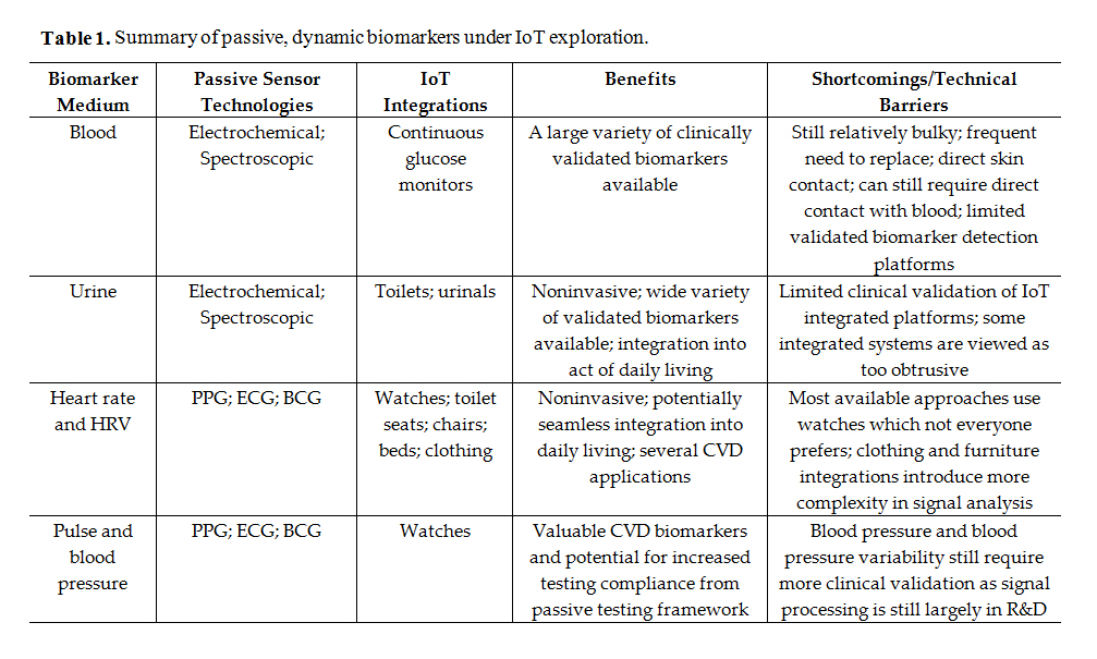 Integrating sensors into furniture and other structures used within the home is another increasingly explored area of passive IoT biomarker monitoring with significant potential for CVD monitoring. For example, chair-shaped systems that measure blood pressure biomarkers using similar technologies in smartwatch systems have been prototyped and tested [44]. Sleep monitoring using microwave based detection sensors placed under the bed sheet are advantageous in that they do not require contact with skin [45], while Gleichauf, et al. combined both microwave radar sensors and time-of-flight distance sensors for evaluating breathing rates in neonatal environments [46]. Pressure sensors have similarly been used to detect disordered breathing during sleep [47], and BCG signals have been used to assess sleep apnea [48]. Bed-integrated BCG sensors can also help detect cardiac arrhythmias [49] and have been explored for identifying reduced cardiac function in impending heart failure in an elderly patient [50]. Toilet seats with integrated ECG, PPG, and BCG sensors have been explored for accurate blood pressure, stroke volume, and blood oxygenation monitoring [51,52]. These systems aim to take advantage of frequent use and skin contact without requiring a wearable to collect longitudinal data for real-time CVD monitoring with future interests in heart failure patients. Toilets also open the possibility of passive urine testing and have already been explored within urinals [53]. As the urinalysis capabilities of these systems improve, broader CVD-monitoring applications arise. For example, the ability to measure urine sodium routinely not only may help assess CVD risk [16], but longitudinal profiling may provide prognostic information on pending heart failure compilations [54] as well as help assess treatment efficacy [55]. However, a recent clinical trial highlights the need for more research to reach the levels of consistency needed for clinical applications [56]. Though often more difficult with regards to signal analysis, an increasing use of deep learning models to analyze bio-signals from ECG, PPG, and BCG, instead of manually extracting features, are providing superior approaches to extracting personalized CVD signals in these increasingly demanding environments [57]. Table 1 summarizes these passive, dynamic biomarkers for CVD applications and their benefits and shortcomings.