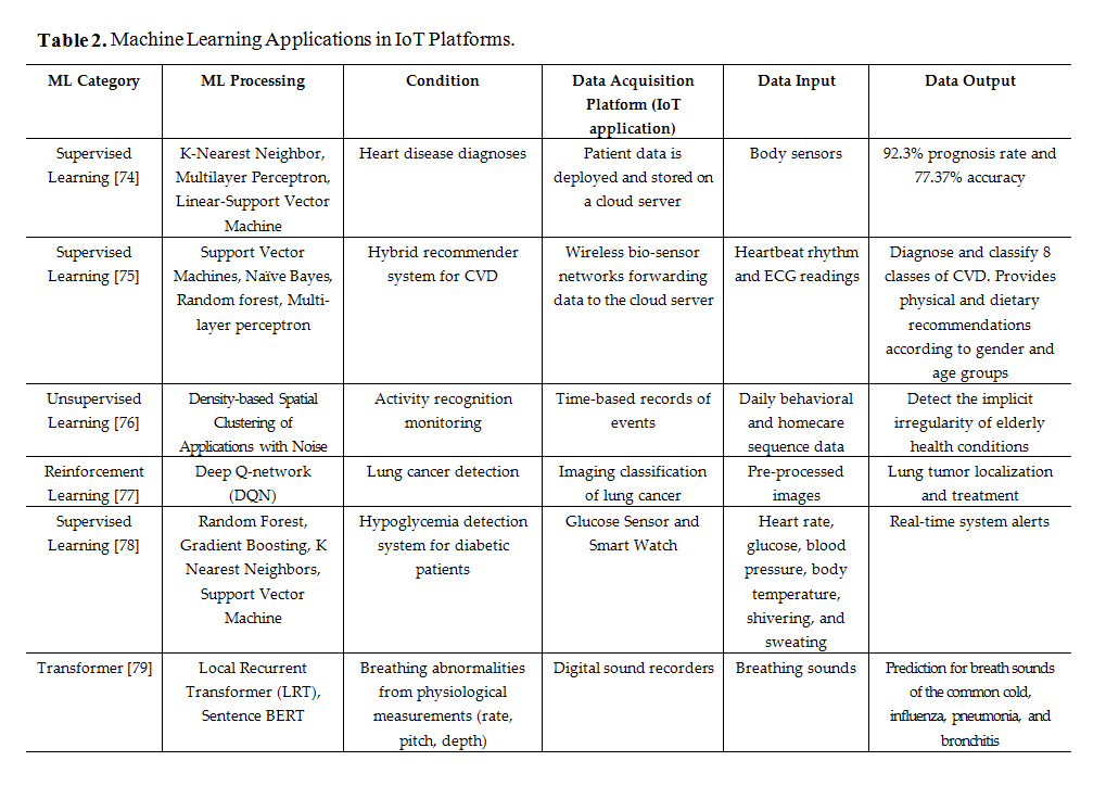 Integrating AI and ML with IoT has greatly impacted the way passive monitoring of older populations is conducted. AI and ML algorithms can analyze large amounts of data generated by wearable devices, sensors, and health records to identify patterns and predict the onset of disease [58]. This has led to increasingly more accurate and efficient monitoring that leads to earlier detection and prevention of chronic conditions. For example, the digital twin-enabled Twin Precision Treatment Program performed a 3 month study on 64 individuals using CGMs, Digital Twin technology, ML algorithms, and precision nutrition to aid treatment of patients with Type 2 diabetes which resulted in a significant reduction in blood pressure and a decrease in the percent of patients taking antihypertensive medications from 35.9% at baseline to 4.7% at 90 days [59]. Other applications can be viewed in Table 2. ML algorithms deployed on wireless, wearable ECG monitor data have been shown to be significantly accurate at automatically classifying cardiac anomalies among the elderly population [60]. The growth in these opportunities has largely stemmed from advancements in the processing power of computers that has allowed faster and more complex calculations on larger datasets [61]; widespread cloud computing services that enable efficient and safe storage and sharing of vast amounts of data [62]; widespread availability of high-speed internet connectivity [63]; widespread adoption of powerful mobile devices [64]; IoT devices used to monitor patients' health in real-time and provide personalized recommendations and interventions [65]; and blockchain technologies working towards enabling authentic data sharing and interoperability across healthcare organizations [66]. These advancements have led to increased use of the following ML algorithms within IoT systems for tracking CVD biomarkers among the elderly: