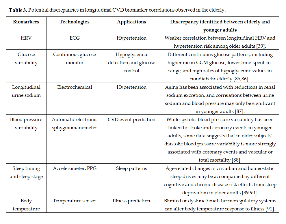 Passive IoT IntegrationSmartwatches and other wrist-borne devices offer some of the most widely tested and adopted technologies for health and wellness monitoring [34]. In addition to acute care applications like fall detection, CVD biomarker monitoring applications are emerging. For example, accelerometer-based activity monitoring has shown to be useful for predicting total CVD incidence, stroke, and coronary heart disease among adults with hypertension [28] as well as heart failure and Type 2 diabetes incidence [35]. Patch-like wearables worn on the skin collecting ECG data offer high-quality cardiac monitoring for a variety of arrhythmias [36], but heart rate monitoring capabilities of smartwatches are improving quickly and in use for detection of atrial fibrillation and preferred over patch-based systems among older adults [37]. HRV has grown in use for wellness and fitness applications but is also emerging as a potential tool for chronic disease monitoring. HRV provides a potential biomarker for hypertension and CVD risk and treatment monitoring [38]. Yet, as some studies still demonstrate, digital biomarkers derived from heart rate and HRV data must be taken from the elderly populations as age-related differences are likely [39].