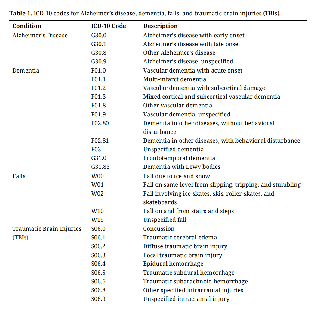 The validity of these measures was ensured by utilizing standardized ICD-10 codes for fall-related injuries, Alzheimer’s disease, dementia, and TBIs. The following ICD-10 codes were used [22] (Table 1):