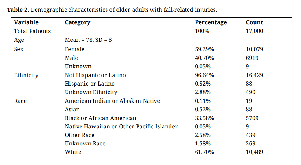 The dataset included 17,000 older adults aged 65 and above, who had experienced falls, spanning a wide range of ages from 65 to 89 years, with an average age of 78 years and a standard deviation of 8 years. The demographic breakdown revealed a predominant female representation at approximately 59.29%, compared to 40.70% male, and a minimal percentage (0.05%) with unspecified sex. Ethnically, the majority were non-Hispanic or Latino (96.64%), with a small representation of Hispanic or Latino individuals (0.52%). Racial demographics showed a significant portion of White individuals (61.70%), followed by Black or African American (33.58%). Other racial categories included Asian (0.52%), American Indian or Alaskan Native (0.11%), and Native Hawaiian or Other Pacific Islander (0.05%), with a small percentage of patients identified as other races (2.58%) or unknown (1.58%) (Table 2).