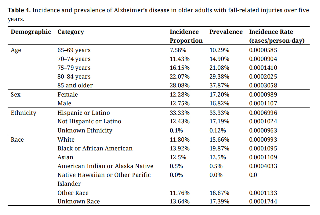 The analysis of falls among older adults with dementia revealed significant demographic patterns. Among age groups, individuals aged 85 and older exhibited the highest incidence proportion at 28.08%, with a prevalence of 37.87% and an incidence rate of 0.0003058 cases per person-day. In contrast, those aged 65–69 years had the lowest incidence proportion at 7.58%, with a prevalence of 10.29% and an incidence rate of 0.0000585 cases per person-day.