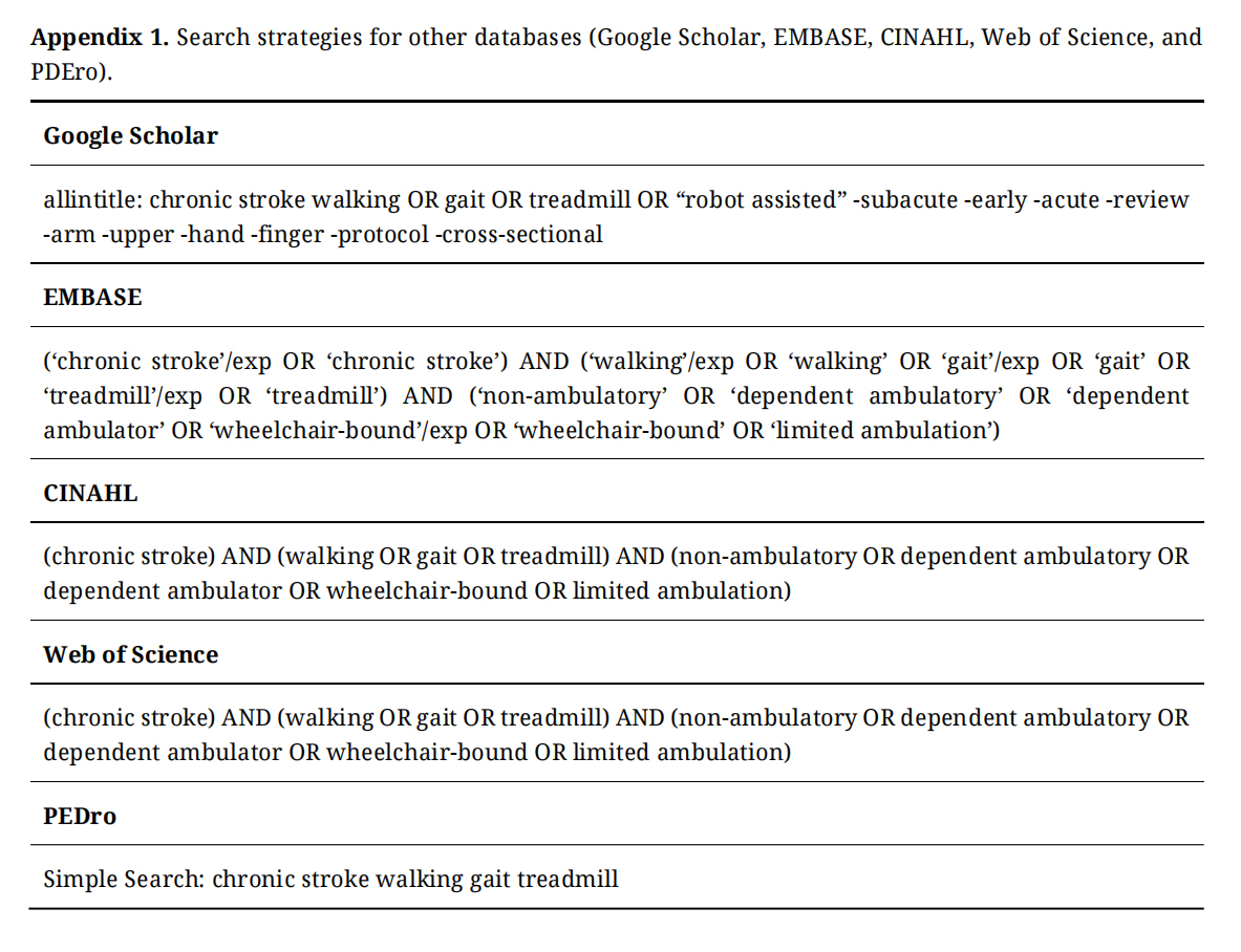 This review focused on rehabilitation of the chronic stroke survivors with dependent ambulation utilizing assisted walking exercise. A combination of controlled Medical Subject Headings (MeSH) and free-text terms relating to the key search terms of “stroke”, “walking”, and “dependent ambulatory” were used to search the following six major databases: PubMed, Google Scholar, EMBASE, CINAHL, Web of Science, and Pedro. The literature search was conducted in November 2024, with search strategies tailored for each database (See Table 1).