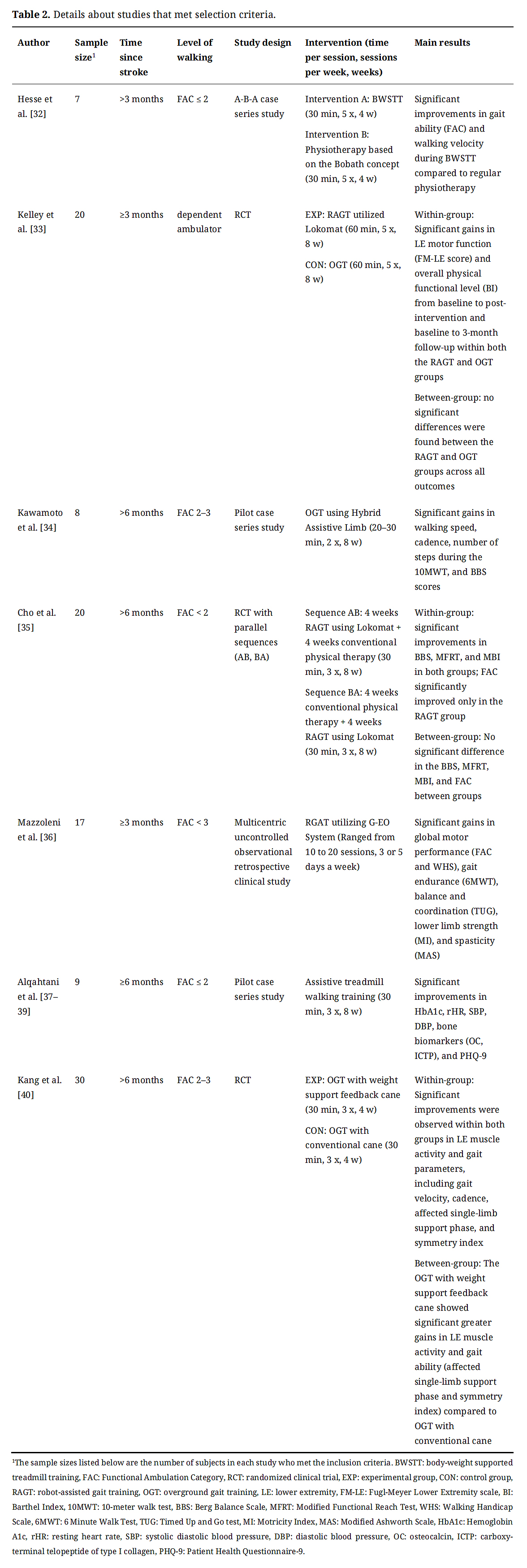 CVDs, cardiovascular diseases; FAC, Functional Ambulation Category; PEDro scale, Physiotherapy Evidence Database scale; BWSTT, body-weight supported treadmill training; RCT, randomized clinical trial; EXP, experimental group; CON, control group; RAGT, robot-assisted gait training; OGT, overground gait training; LE, lower extremity; FM-LE, Fugl-Meyer Lower Extremity scale; BI, Barthel Index; 10MWT, 10-meter walk test; BBS, Berg Balance Scale; MFRT, Modified Functional Reach Test; WHS, Walking Handicap Scale; 6MWT, 6 Minute Walk Test; TUG, Timed Up and Go test; MI, Motricity Index; MAS, Modified Ashworth Scale; HbA1c, Hemoglobin A1c; rHR, resting heart rate; SBP, systolic diastolic blood pressure; DBP, diastolic blood pressure; OC, osteocalcin; ICTP, carboxy-terminal telopeptide of type I collagen; PHQ-9, Patient Health Questionnaire-9; ADL, activities of daily living