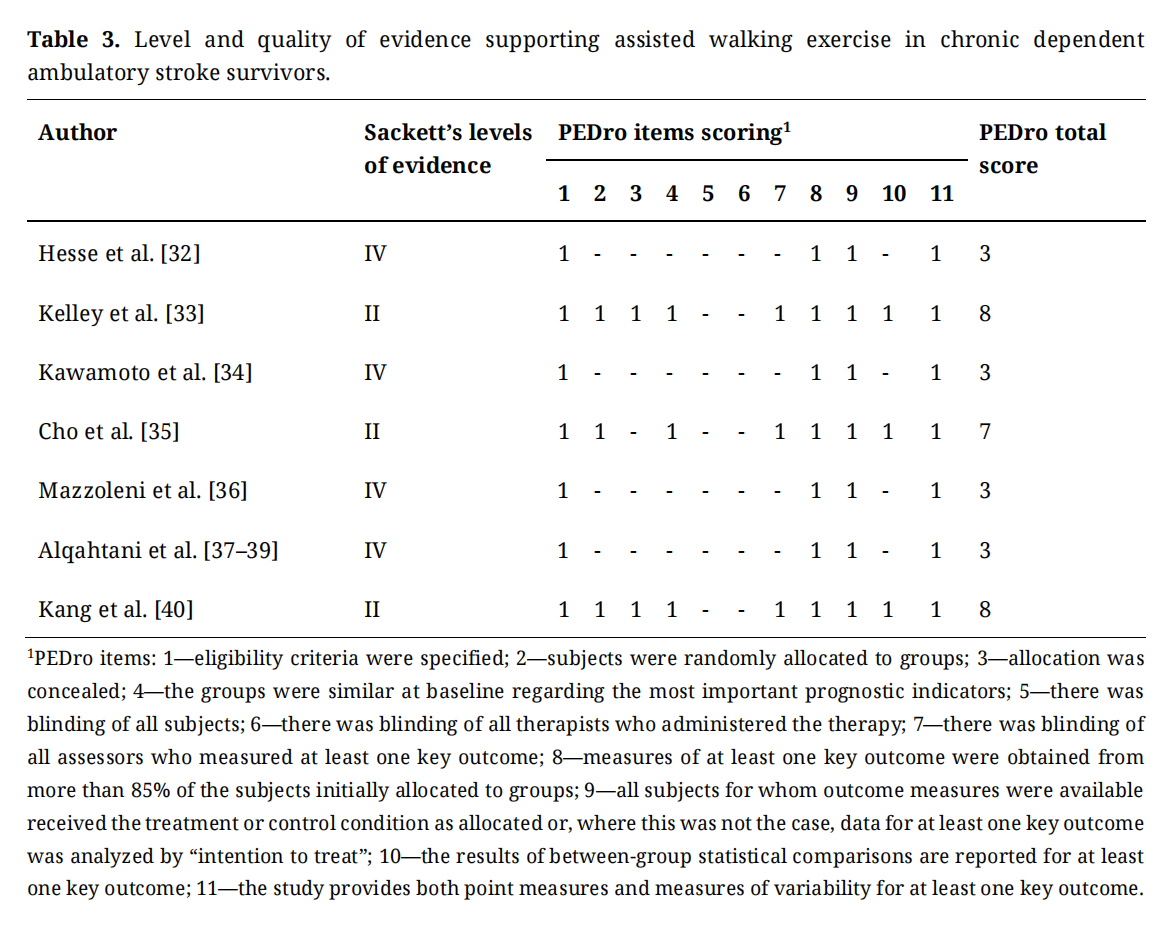 In conclusion, this mini-review highlights the complexities and challenges of including chronic dependent ambulatory stroke survivors in walking exercise programs. The reviewed studies indicated the feasibility of clinical research on the effect of walking exercise programs in chronic dependent ambulatory stroke survivors. Although the studies indicated the preliminary efficacy of assisted gait training in improving motor function such as walking ability, gait parameters, balance, and muscle activity, the levels of evidence were low to moderate due to small sample sizes and inconsistent methodologies. Additionally, the lack of standardized intervention prescriptions and variability in outcome assessments further complicates the ability to compare and generalize findings. Future studies should aim to standardize design and measures, enhance accessibility, and optimize training protocols better to support the long-term health of chronic dependent ambulatory stroke survivors.