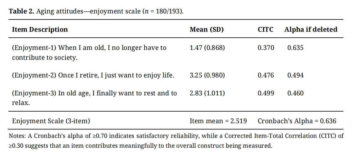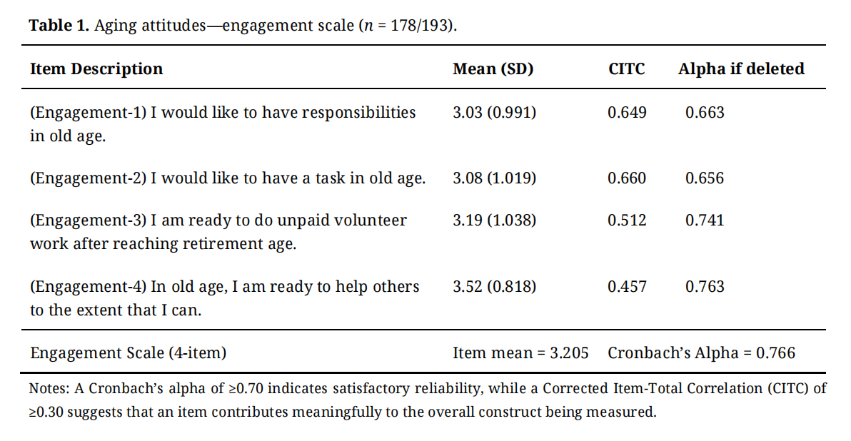 The items in the measurement tool were designed to capture two dimensions of aging attitudes. One dimension reflects the attitude of “staying active and engaged in old age”, indicating a desire to remain productive and involved. The other dimension reflects the attitude of “enjoying life in old age”, emphasizing the freedom, time, and reduced external obligations in old age to pursue enjoyable activities that may have been postponed earlier in life.
