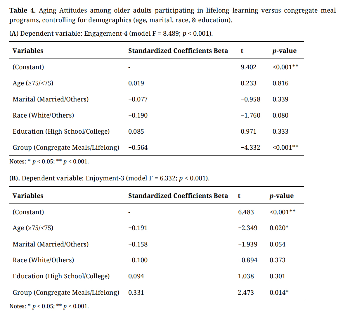 Table 4. Aging Attitudes among older adults participating in lifelong learning versus congregate meal programs, controlling for demographics (age, marital, race, & education).
