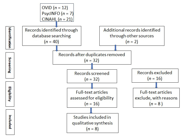 We found 40 results from our search, MEDLINE (12), PsycINFO (7), and CINAHL (21). After removal of 10 duplicates, we included 30 papers from our search which met the pre-determined criteria. 16 papers were screened out after reviewing the titles and abstracts. 8 papers were screened out after reviewing the full papers. 2 papers identified through other sources were included. A total of 8 papers were included in this review (Figure 2). Studies of ACP for PWD, particularly exploring the appropriate timing and ACP discussion were scarce. There were unique challenges facing the surrogates of PWAD in the considerations of the appropriate timing, the barriers as well as the facilitators of ACP.