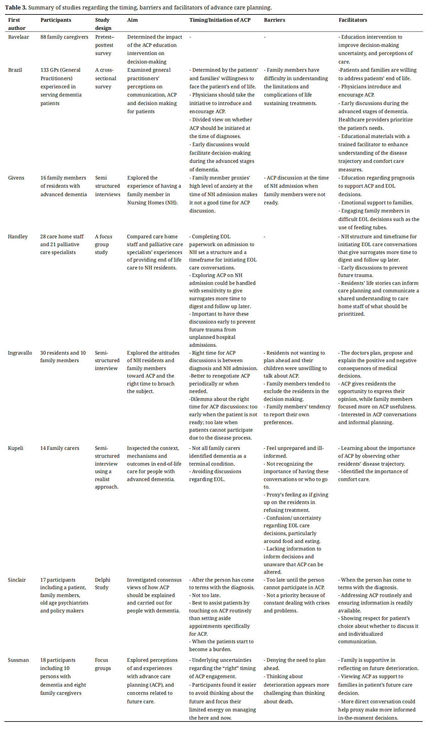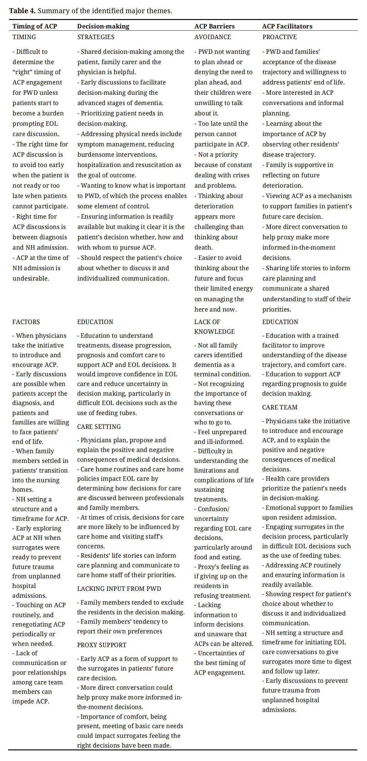 Conclusions: Factors affecting the appropriate timing of ACP discussion with people with dementia (PWD) and family include care team taking the initiative to facilitate ACP, early discussions routinely, and updating it periodically. Avoidance, competing priority with current crises and problems, difficulty in accepting future deterioration and challenging to think about death, lacking knowledge on ACP and treatments, feeling as if giving up on PWD in refusing treatment are some ACP barriers. ACP facilitators include PWD and families’ acceptance of the disease trajectory and willingness to address end of life, viewing ACP as support for surrogates for future care decision, education to improve understanding of the disease trajectory, and comfort care to guide decision making, and care team seeing it as a priority.