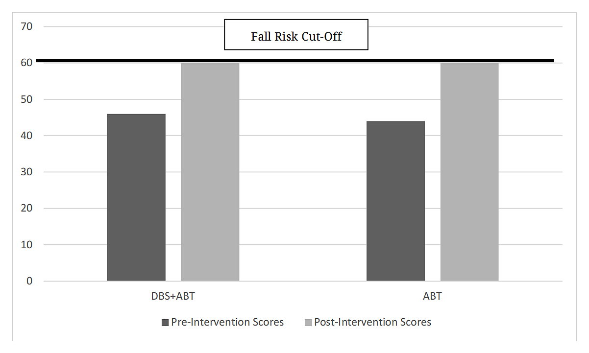 The results of the descriptive statistics showed that the DBS+ABT group had lower values for the ABC-6Scale percentage score difference before and after intervention (M = 14.8, SD = 19.36) than the ABT group (M = 15.93, SD = 16.56). The results of the descriptive statistics also showed that the post interventions ABC-6 Scale percentage scores for the DBS+ABT group (M = 60.65, SD = 20.32) and the ABT group (M = 59.93, SD = 23.53) were at the cut off score of 60% that distinguishes between fallers and non-fallers secondary to balance confidence (Figure 1) [20].
